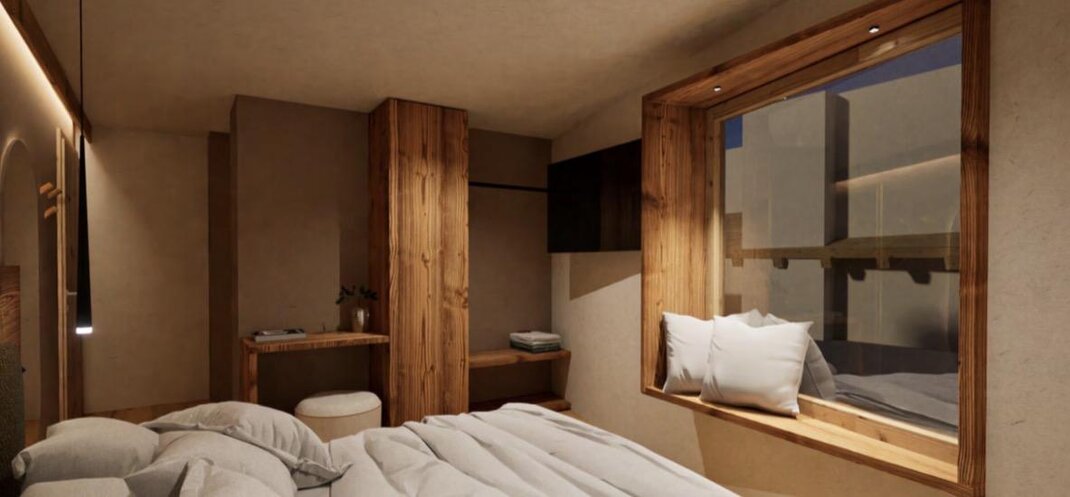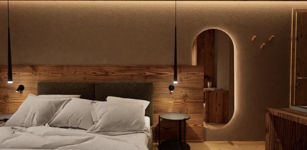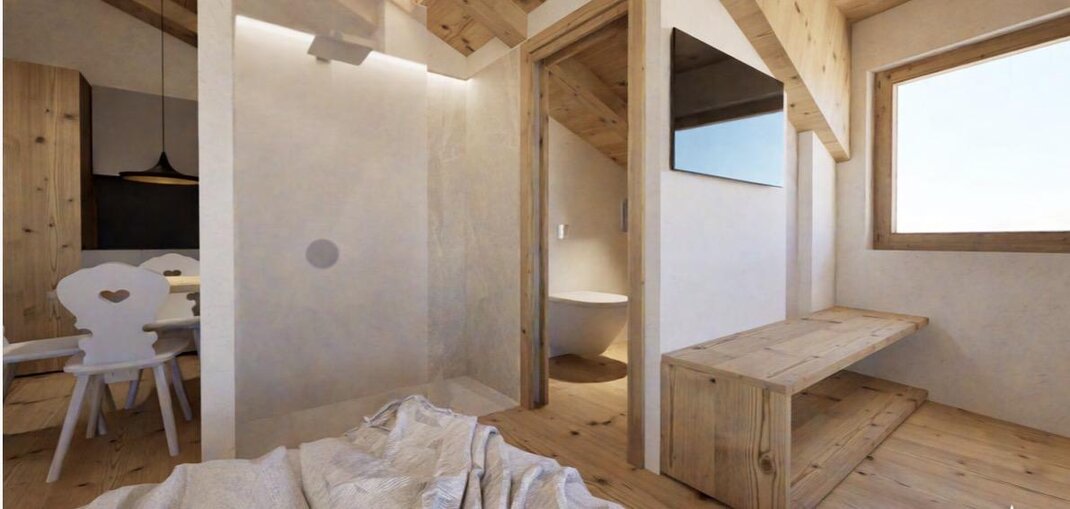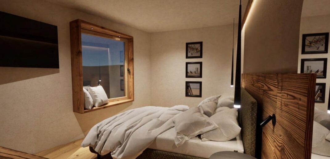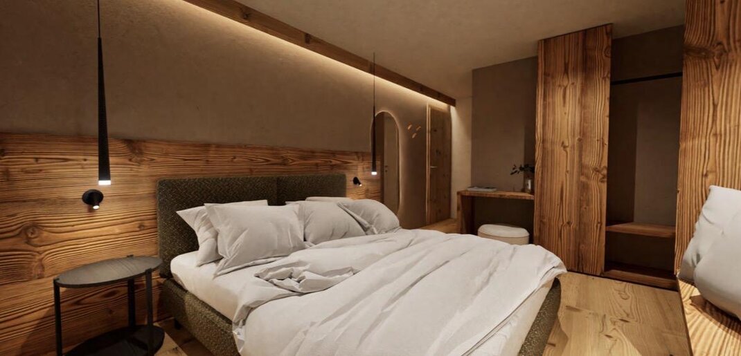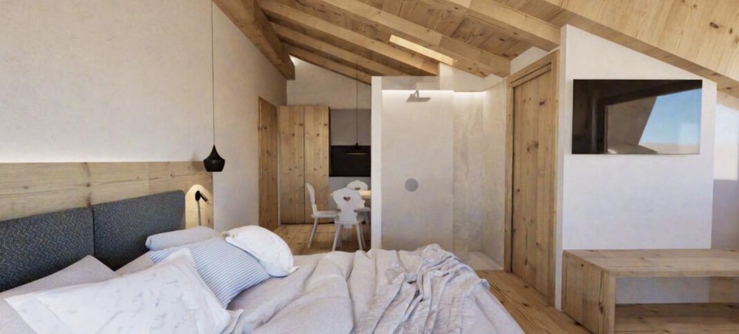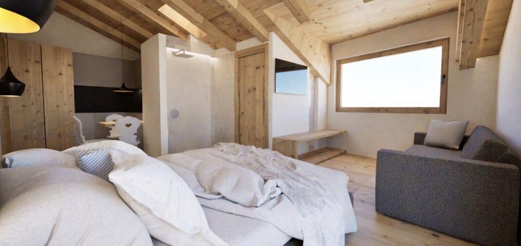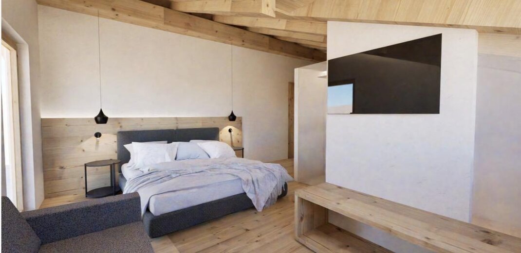 Vollständig mit antikem Holz verkleidet, schafft dieses Zimmer eine gemütliche und einladende Atmosphäre. Das Bett mit gepolstertem Kopfteil und die wesentlichen Details machen jeden Moment der Entspannung zu einem besonderen Erlebnis. Ideal für diejenigen, die antike Oberflächen und die Bergatmosphäre lieben.