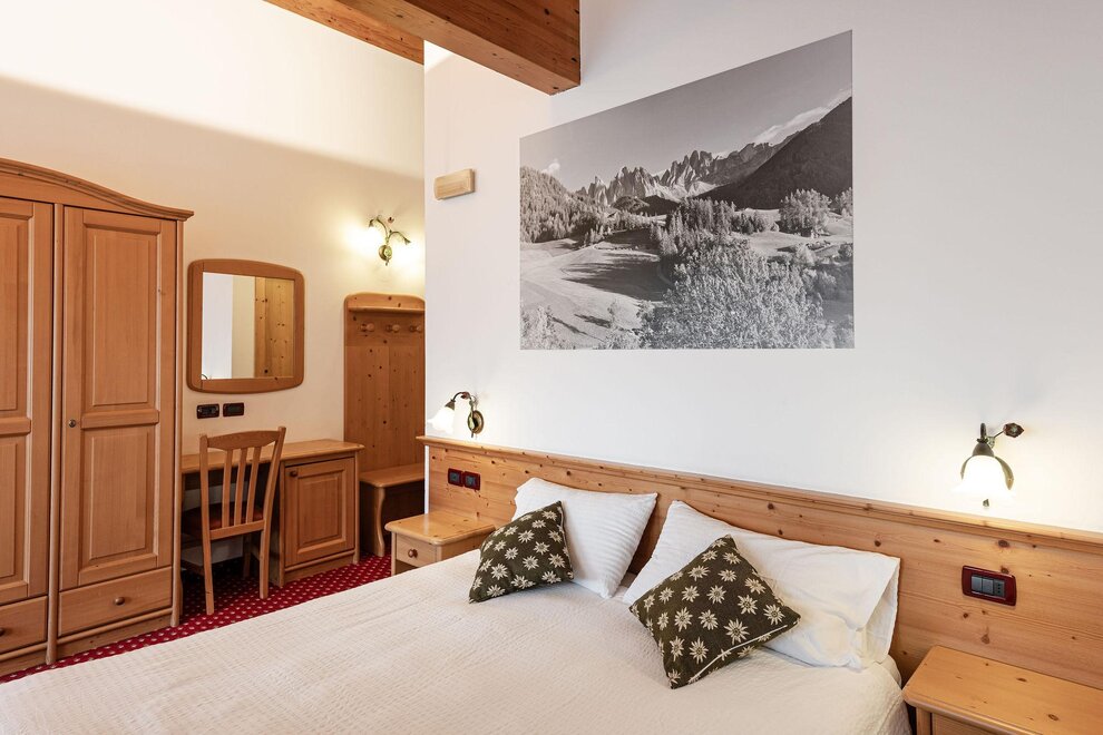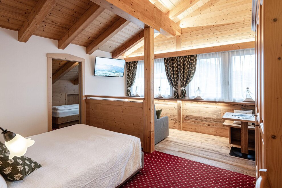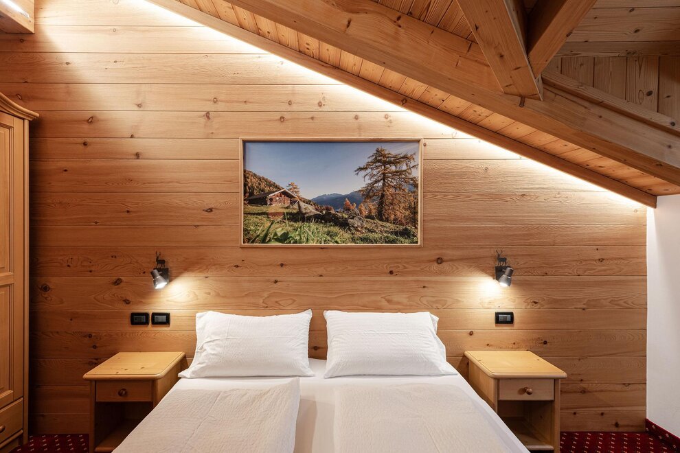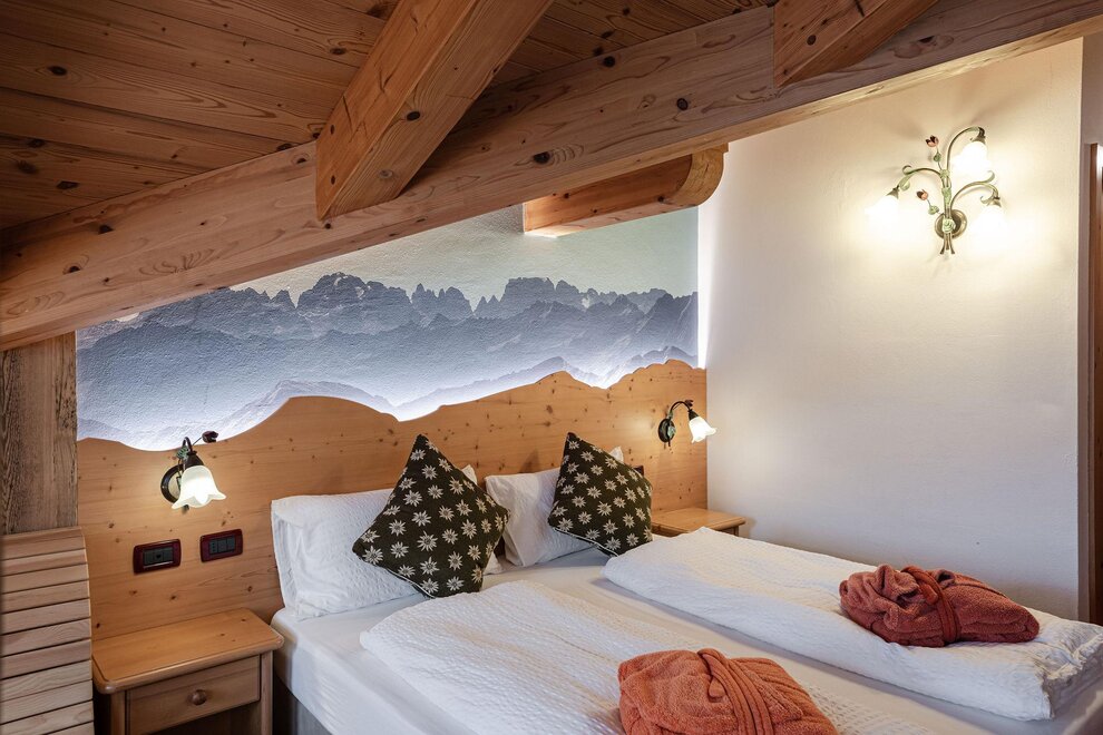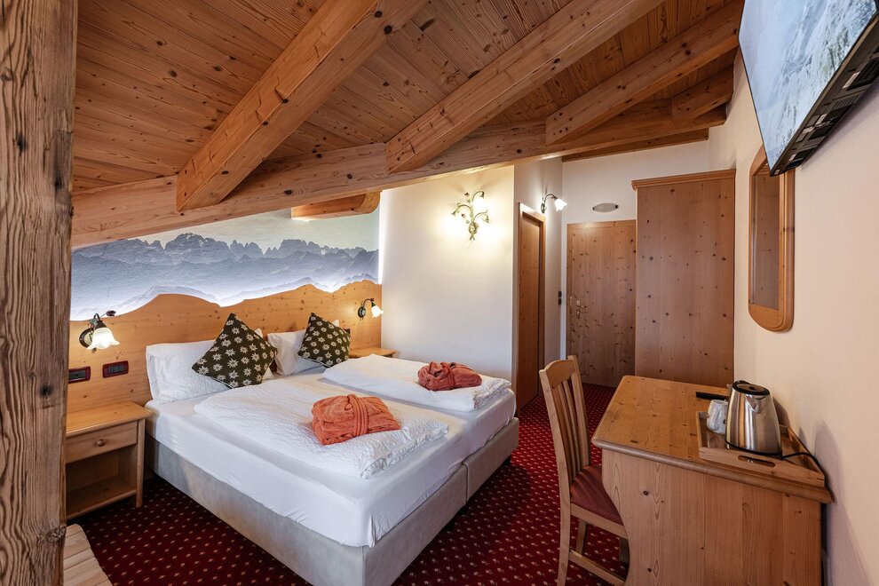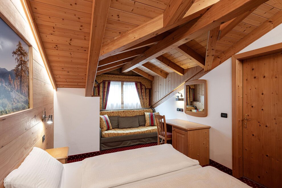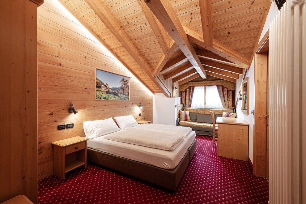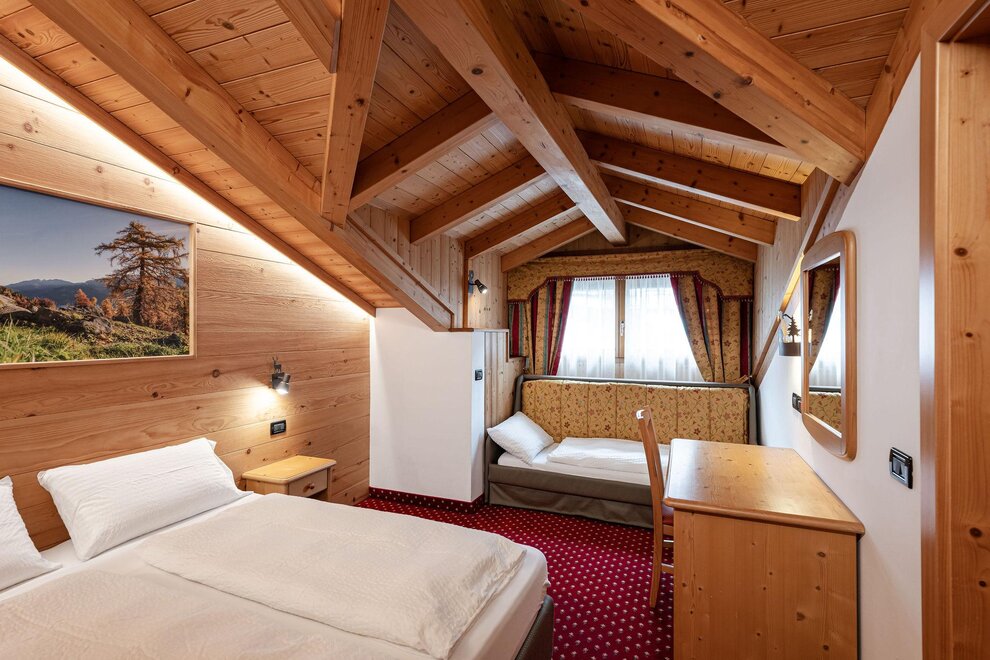 Sie wurden kürzlich renoviert, wodurch sie größer und moderner wurden und stets dem Bergstil folgen. Sie verfügen über ein Doppelbett (umwandelbar in zwei Einzelbetten) und ein zusätzliches Einzelbett. In einigen Zimmern besteht auch die Möglichkeit, ein 4. Bett hinzuzufügen, einige verfügen über einen Balkon, während eines über einen Dachboden mit Panoramafenster verfügt.