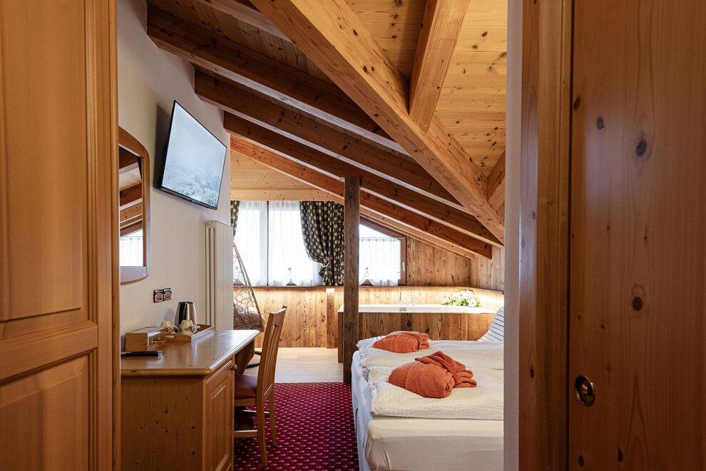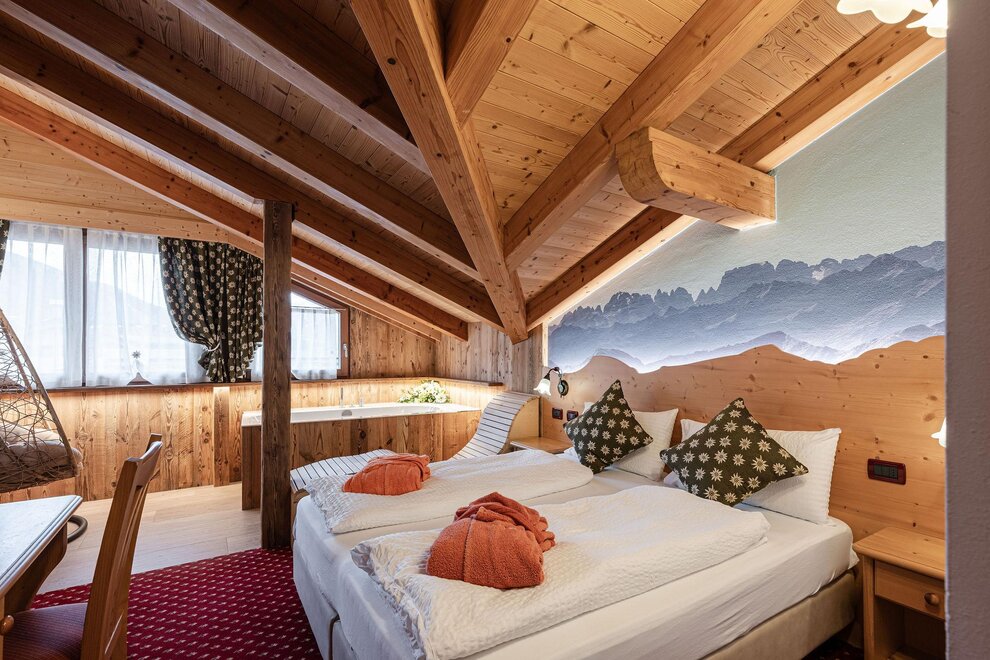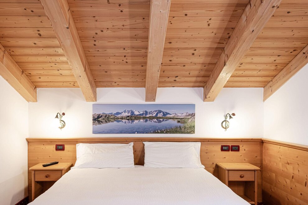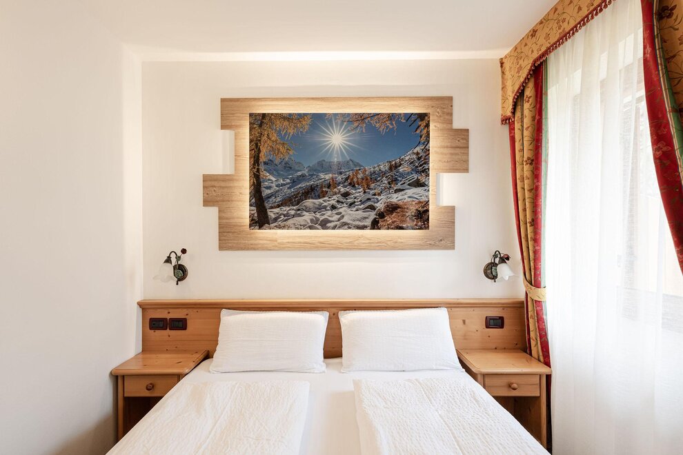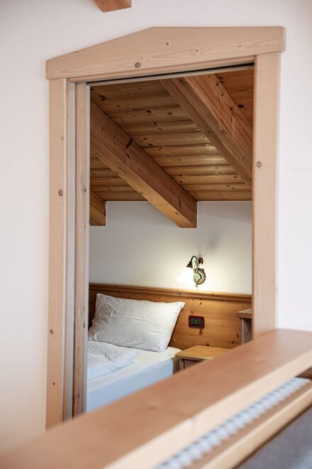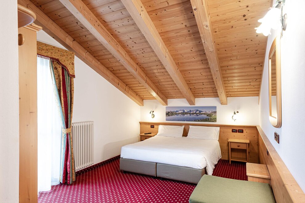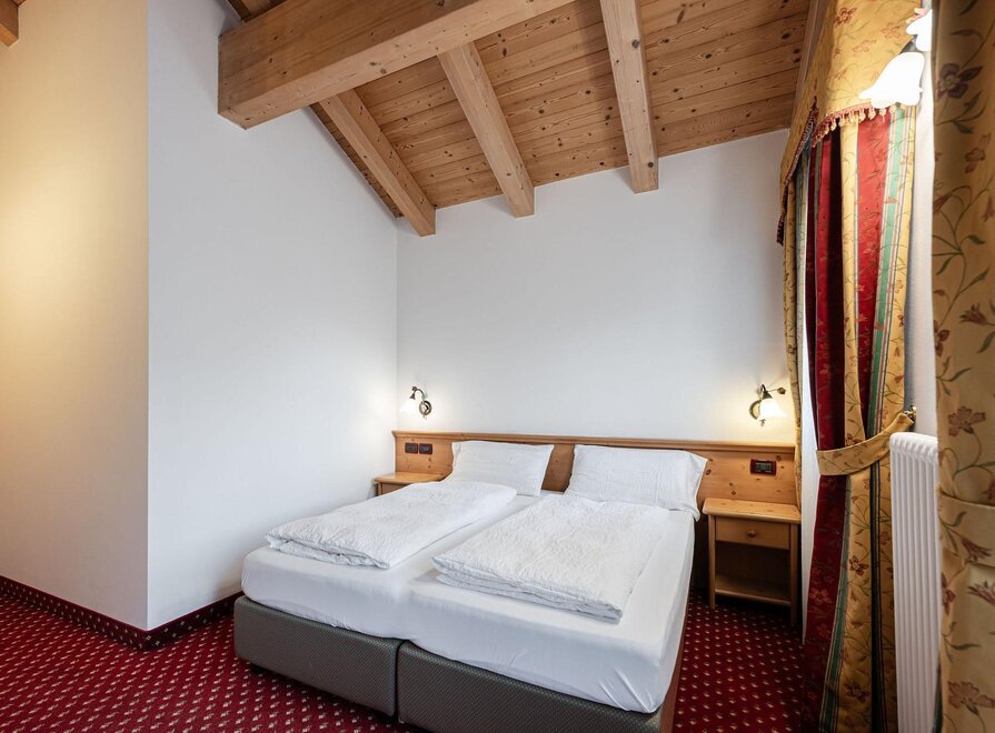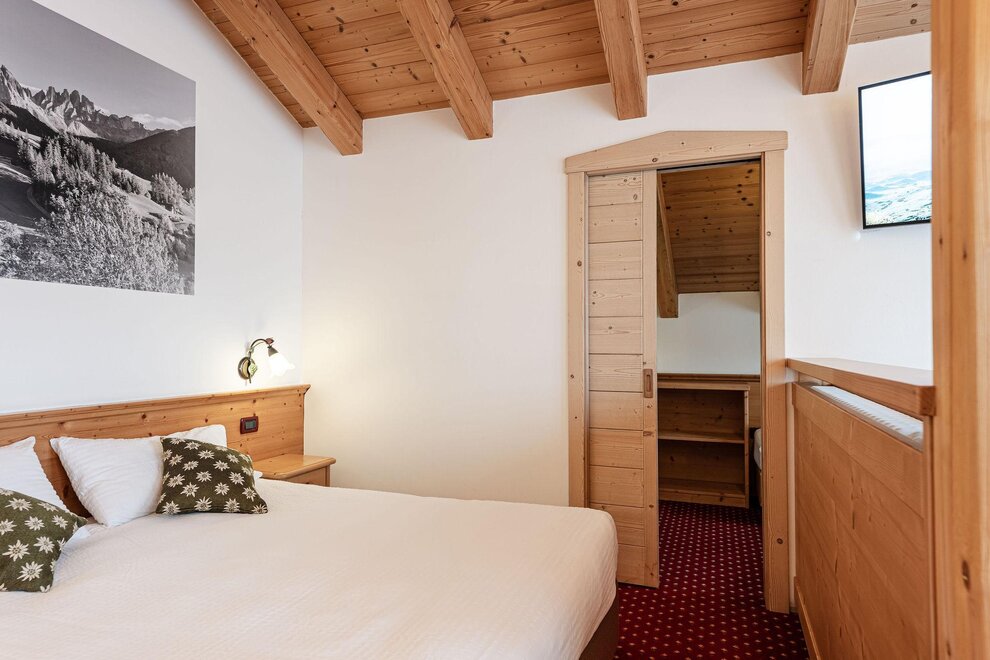 Sie wurden kürzlich renoviert, wodurch sie größer und moderner wurden und stets dem Bergstil folgen. Sie verfügen über ein Doppelbett (umwandelbar in zwei Einzelbetten) und ein zusätzliches Einzelbett. In einigen Zimmern besteht auch die Möglichkeit, ein 4. Bett hinzuzufügen, einige verfügen über einen Balkon, während eines über einen Dachboden mit Panoramafenster verfügt.