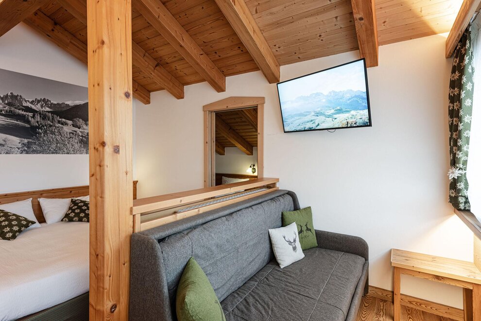 Konzipiert für Familien mit Kindern, im alpenländischen Stil eingerichtet und in den letzten Jahren renoviert. Sie verfügen über ein Doppelbett (umwandelbar in zwei Einzelbetten) und ein Sofa, das in ein Etagenbett für Kinder umgewandelt werden kann. Max. 2 Erwachsene.