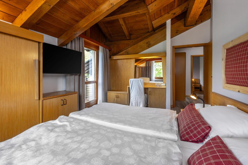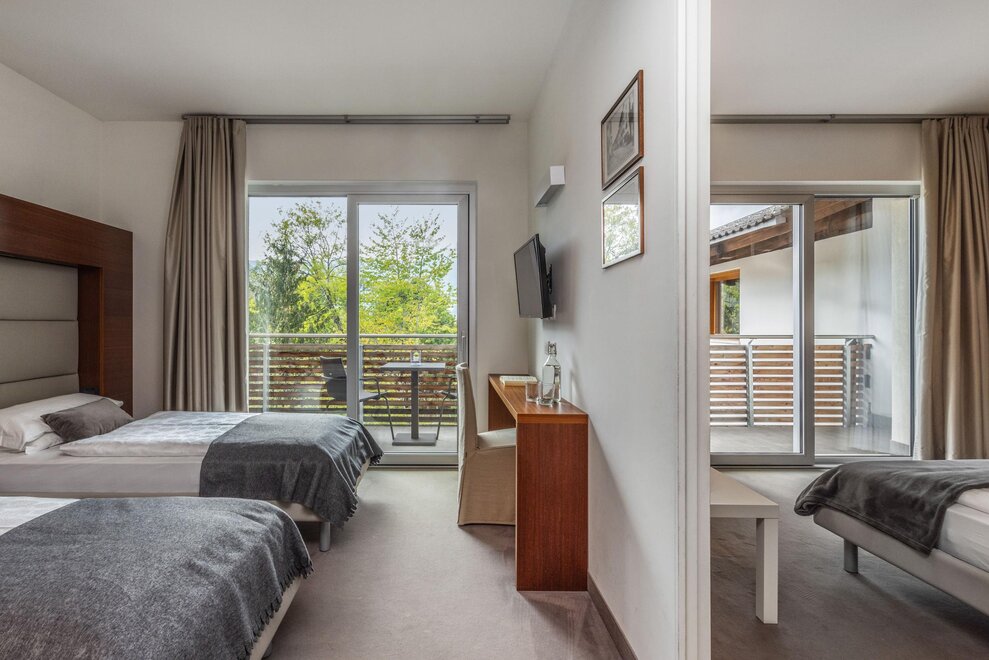 Familienzimmer mit zwei getrennten Doppelzimmer, Balkon, Badezimmer mit Dusche/Bad und Fön, 2 TV LCD, Telefon und Safe.