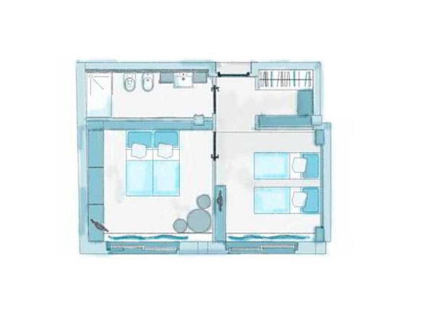 Familienzimmer mit 2 getrennten Doppelzimmer, Balkon, begehbarem Schrank, Badezimmer mit Dusche und Fön, 2 Tv LCD, Minibar, Telefon, Internetanschluss und Safe.