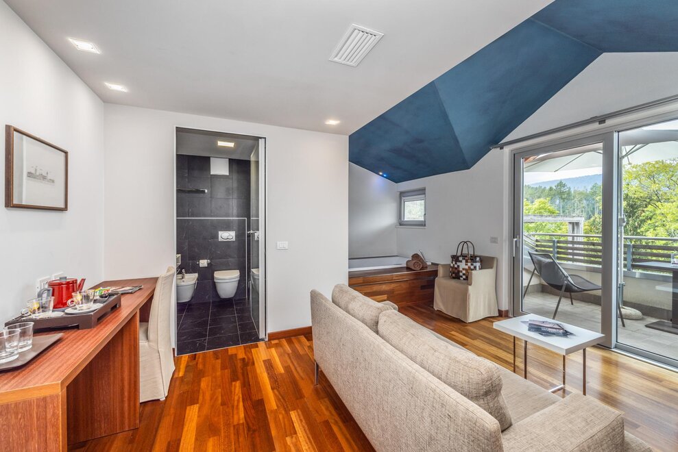 Konfortables Zimmer mit Wohnbereich, Aussichtsbalkon, begehbarem Schrank, Badezimmer mit Dusche und Whirlwanne, Fön, Tv LCD, Minibar, Telefon, Internetanschluss und Safe.