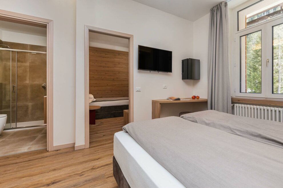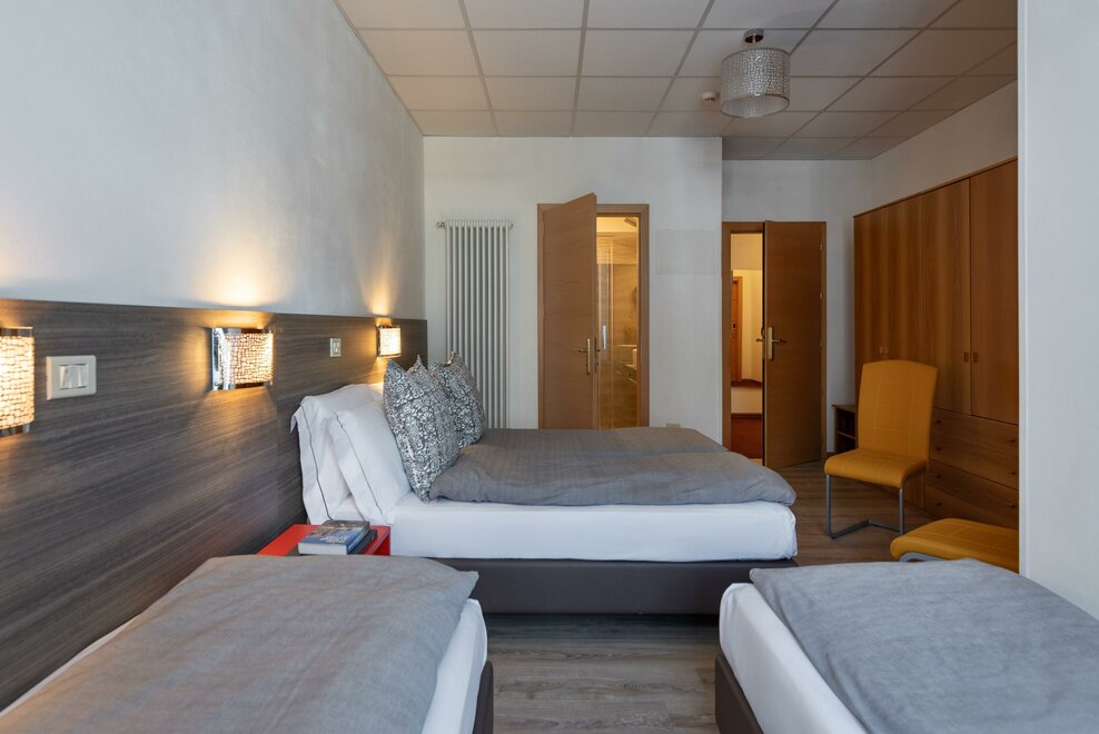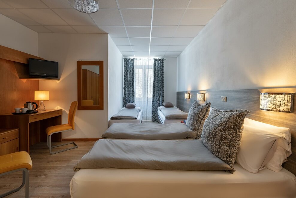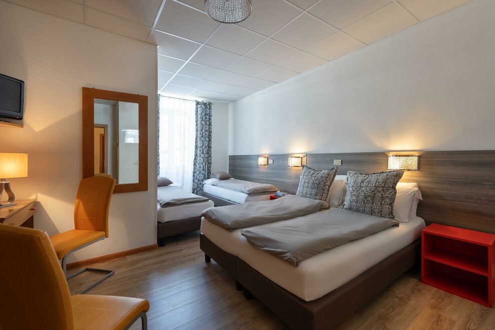 Die Komfort Dreibettzimmer verfügen über einen Balkon und sind mit Kirschholz möbliert. Sie bieten die grundlegenden Annehmlichkeiten wie Haartrockner, Pflegeprodukte, Telefon mit Weckfunktion, 40' Fernseher, Safe und kostenloses WLAN. Alle mit Holzboden.Ausstattung Zimmer/Appartement