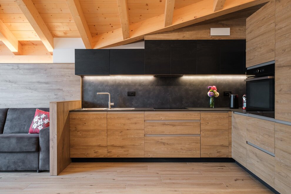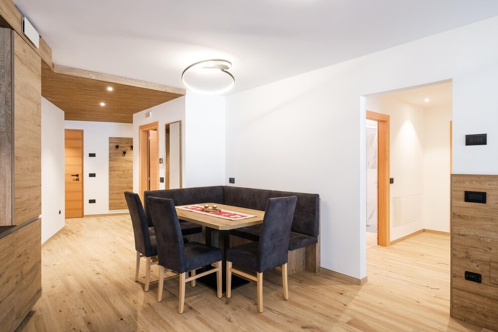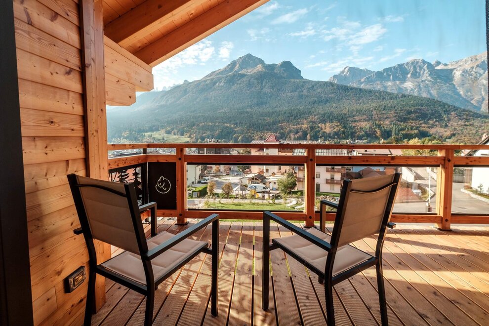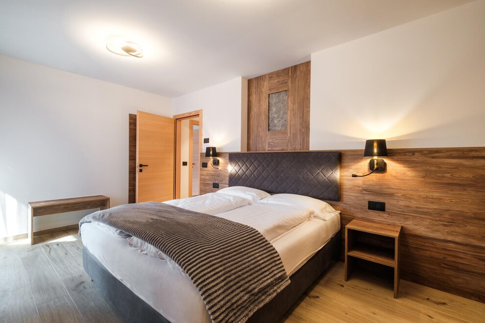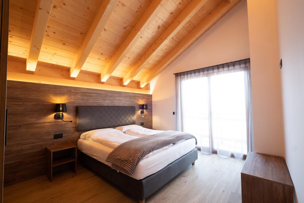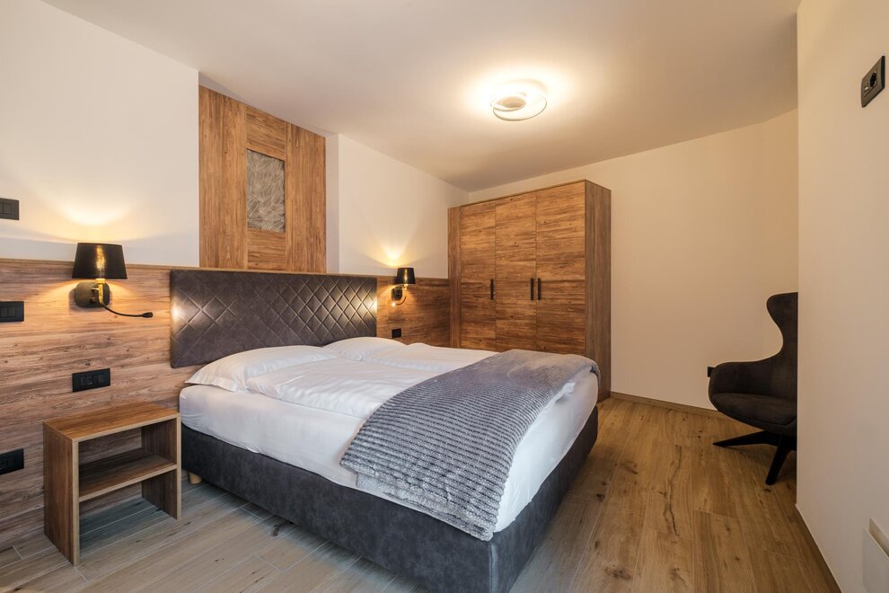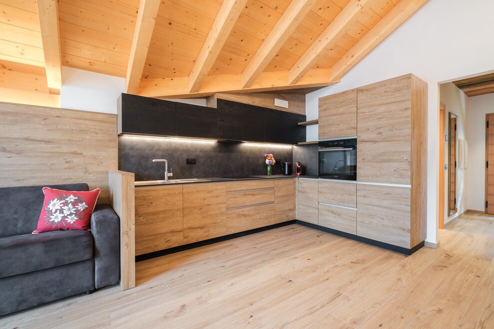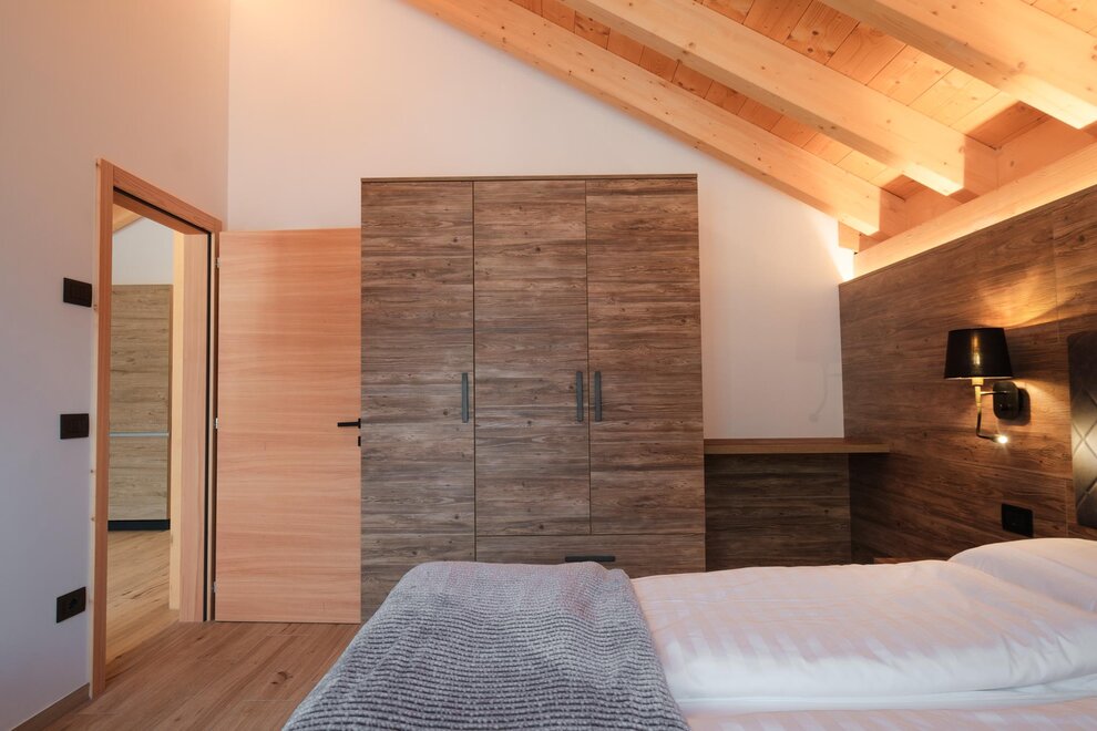 Die beste Wohnung im Dila befindet sich in der obersten Etage. Die Wohnung ermöglicht es Ihnen, die Berge in vollen Zügen zu erleben, denn sie hat ein sichtbares Holzdach und einen großen Balkon, von dem aus Sie den besten Blick auf die Brenta-Dolomiten haben. Das Erlebnis, das diese Wohnung bietet, ist unvergleichlich, denn Holz spielt überall eine große Rolle. Es gibt auch eine gemeinsame Terrasse auf der Rückseite, wo Sie sich in Ruhe entspannen können. Die Wohnung ist 80 Quadratmeter groß und besteht aus zwei Schlafzimmern mit Doppelbett, zwei Bädern, einem Wohnzimmer mit Küche und Schlafcouch. Die gewählte Einrichtung ist eine Mischung aus modernem und bergigem Stil, so dass Sie die Wärme eines Berghauses in Verbindung mit moderner Ästhetik spüren können. Außerdem verfügt die Wohnung über alle Annehmlichkeiten wie einen Smart-TV, eine Kaffeemaschine und einen elektrischen Wasserkocher.