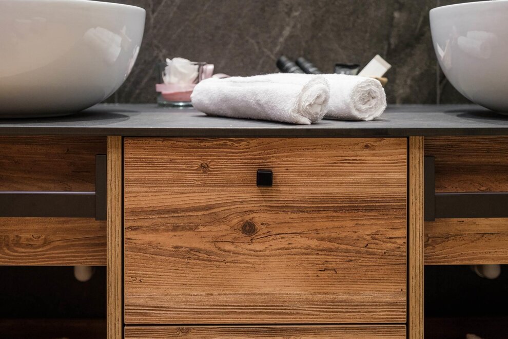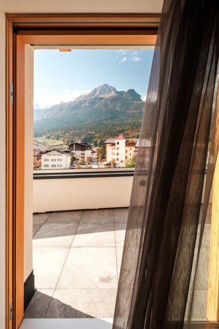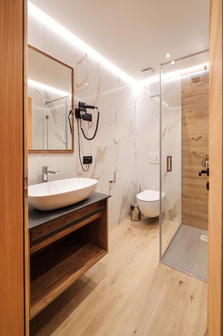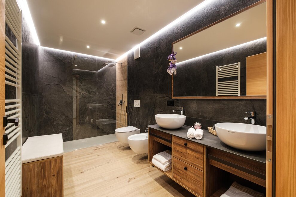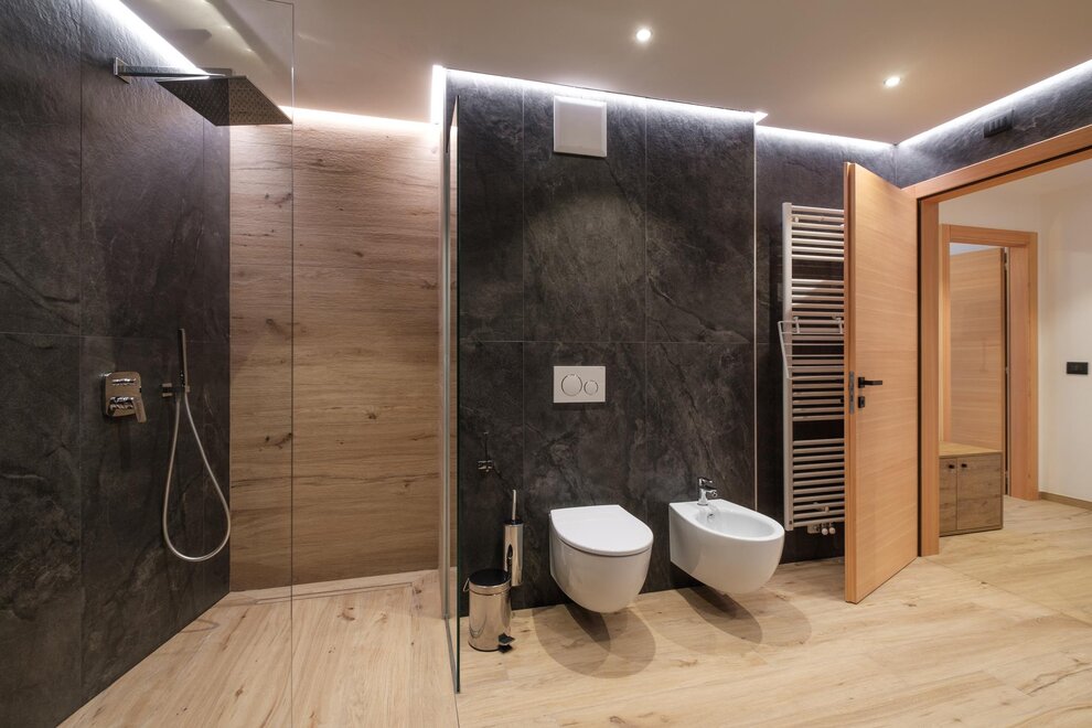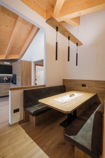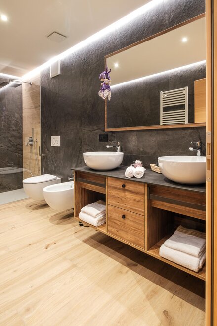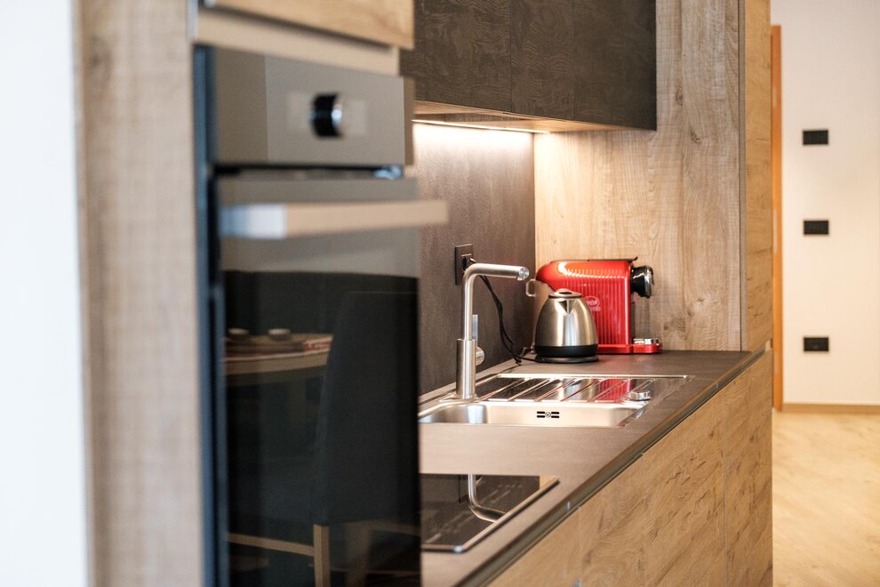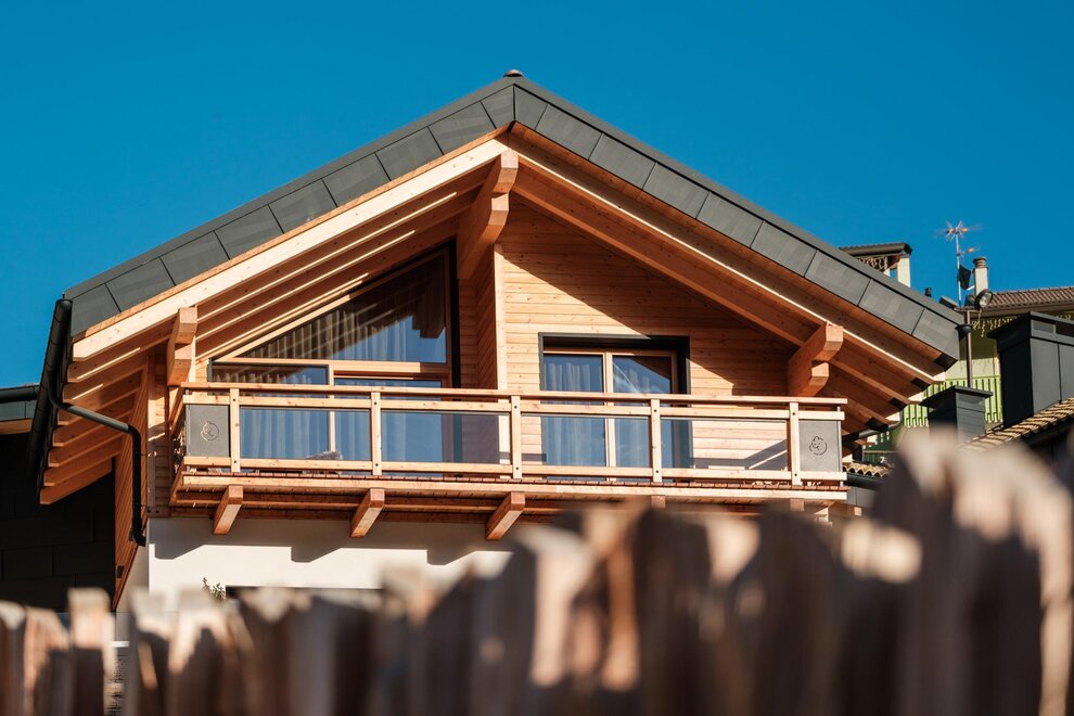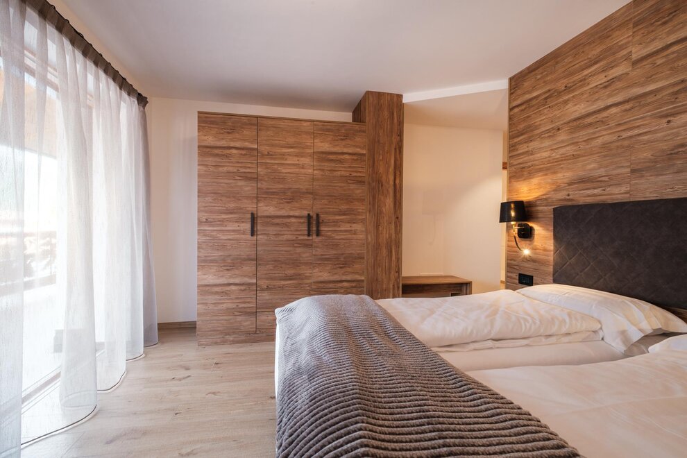 Die beste Wohnung im Dila befindet sich in der obersten Etage. Die Wohnung ermöglicht es Ihnen, die Berge in vollen Zügen zu erleben, denn sie hat ein sichtbares Holzdach und einen großen Balkon, von dem aus Sie den besten Blick auf die Brenta-Dolomiten haben. Das Erlebnis, das diese Wohnung bietet, ist unvergleichlich, denn Holz spielt überall eine große Rolle. Es gibt auch eine gemeinsame Terrasse auf der Rückseite, wo Sie sich in Ruhe entspannen können. Die Wohnung ist 80 Quadratmeter groß und besteht aus zwei Schlafzimmern mit Doppelbett, zwei Bädern, einem Wohnzimmer mit Küche und Schlafcouch. Die gewählte Einrichtung ist eine Mischung aus modernem und bergigem Stil, so dass Sie die Wärme eines Berghauses in Verbindung mit moderner Ästhetik spüren können. Außerdem verfügt die Wohnung über alle Annehmlichkeiten wie einen Smart-TV, eine Kaffeemaschine und einen elektrischen Wasserkocher.