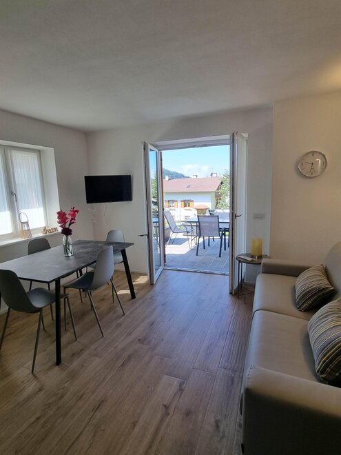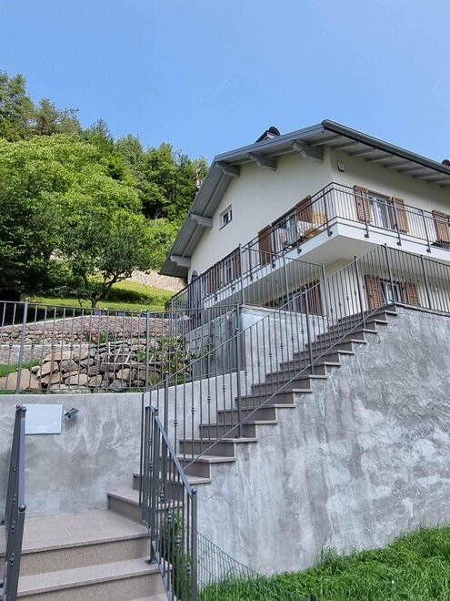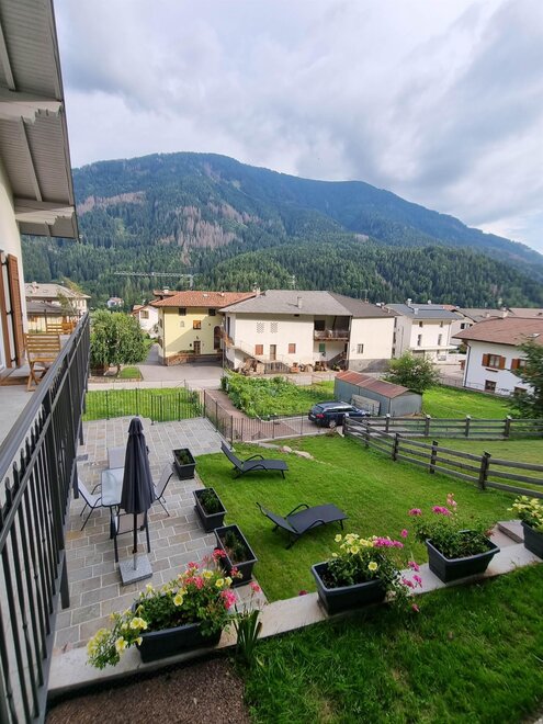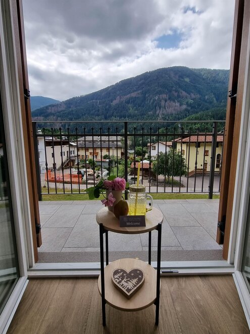 Modern eingerichtetes Zimmer in hellen und pastellfarbenen Tönen, Doppelbett mit in Trentino handgefertigter Matratze, Fußboden aus Feinsteinzeug in Holzoptik, Kleiderschrank mit zwei Schiebetüren, Schreibtisch mit Bar-Kühlschrank, Smart TV Sat, Wi-Fi USB-Buchse, Einzelschlafsofa aus Kunstleder und Balkon mit Blick auf das Dorf und die Berge. Privates, modern eingerichtetes Badezimmer mit Fenster mit natürlichem Licht, großer Dusche, Waschbecken mit großem Einbauschrank, Haartrockner, Wäscheleine, Bidet und hängendem WC. Reichhaltiges süßes und herzhaftes Frühstück nach den Wünschen unserer Gäste, das auf der Terrasse oder in unserem Wohnbereich serviert werden kann.