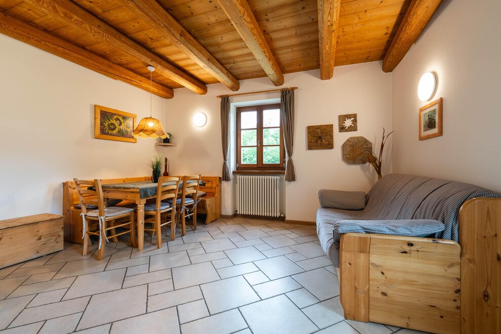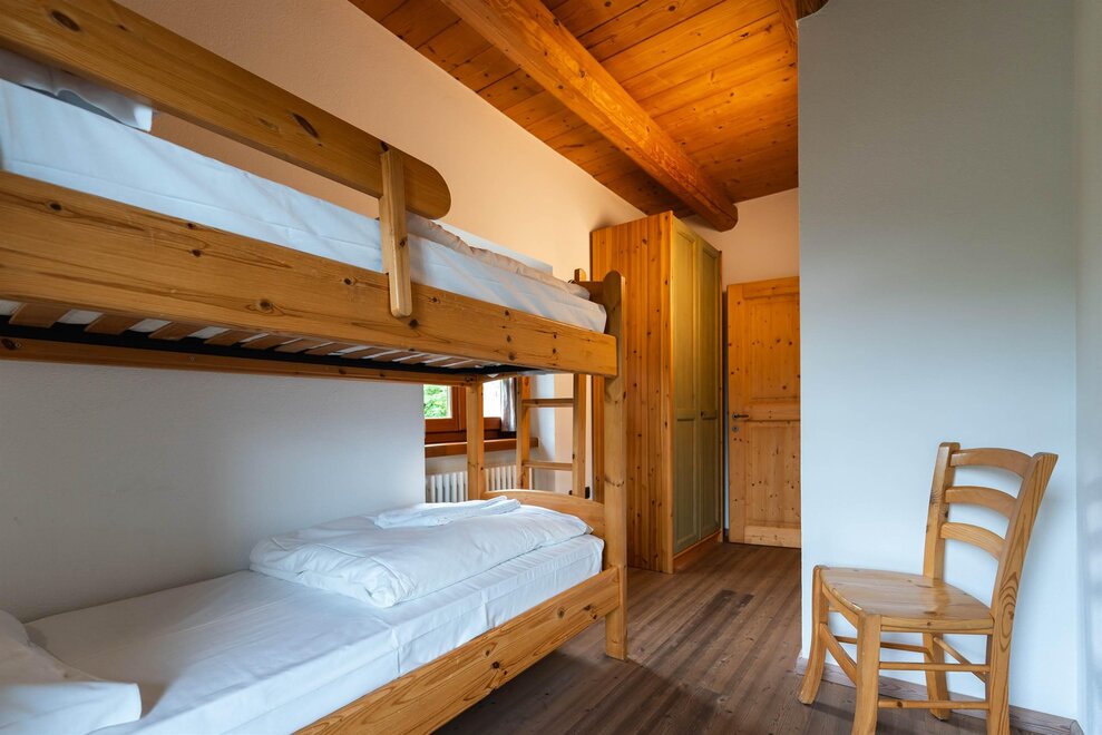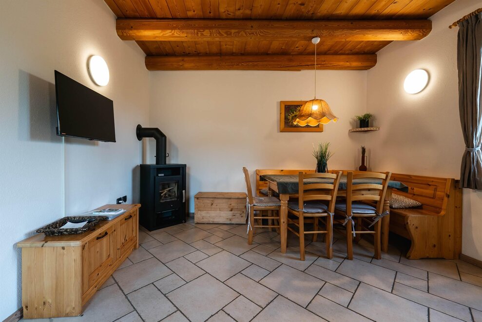 Das Drei- Zimmer Appartement (c.a 68 sqm) erstreckt sich über zwei Geschoße. In erster Etage sind zwei Schlafzimmer (eines mit Doppelbett und Hochbett, das andere mit Stockbett); am Erdgeschoß sind ein Badezimmer mit Dusche,WC und Fön, einen Wohnraum mit Doppel- Schlafhcouch und Holzofen ,einen sehr charackteristisch Abstellraum und eine voll ausgestattete Küche mit Gasherd,