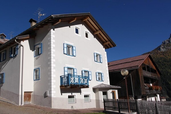 Erdgeschosswohnung mit eigener Heizung, die kürzlich renoviert wurde, in ruhiger Lage am Anfang des Dorfes Vigo di Fassa, mit zwei Schlafzimmern [einem Doppelzimmer und einem Einzelzimmer], Wohnküche und großem Bad. Eigener Parkplatz, kleiner Garten und Skiraum.