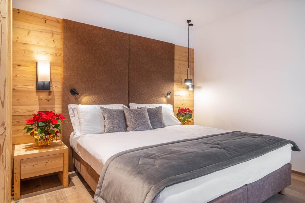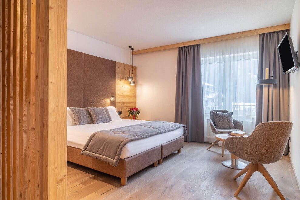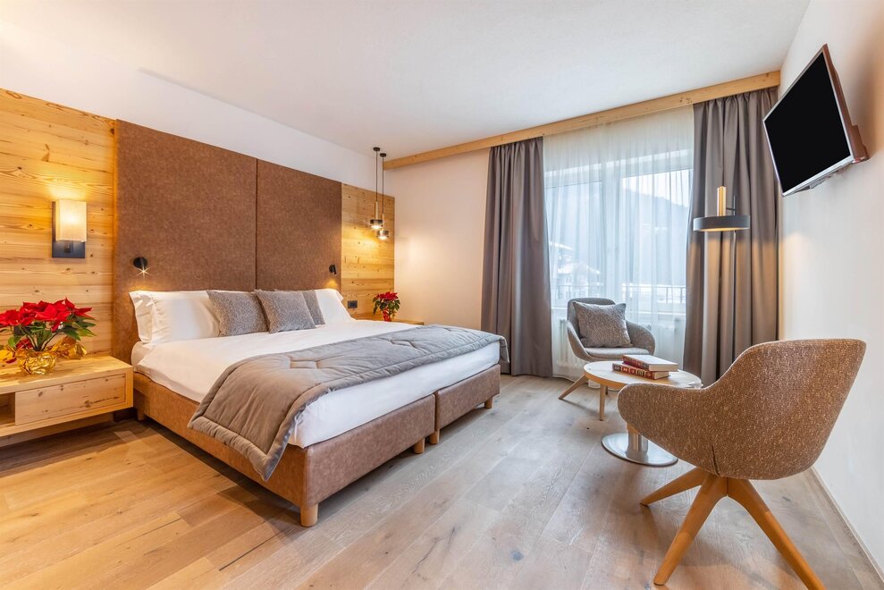 Warme Nuancen, natürliche Materialien und der Blick auf umwerfende Landschaften. Ein Zimmer, das den Charakter der Bergwelt mit der Geborgenheit eines Ortes mit viel Geschichte vereint.