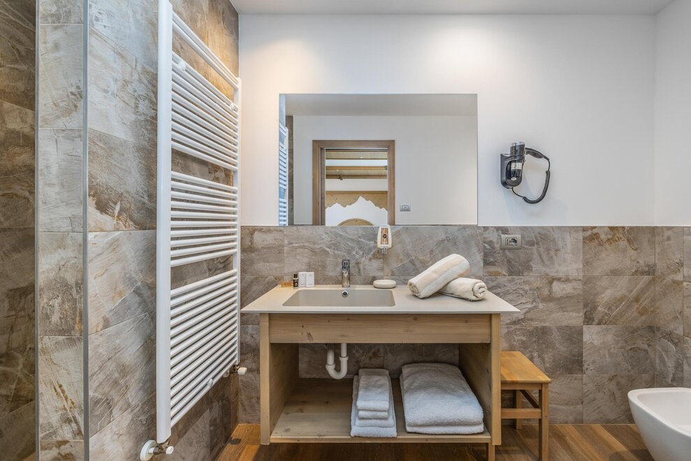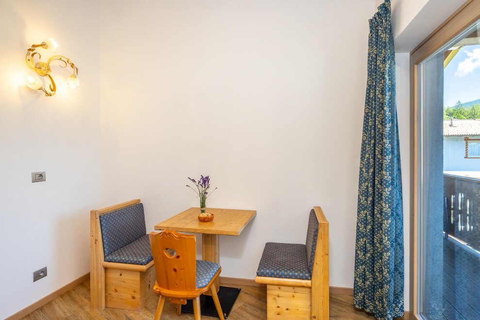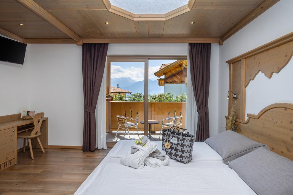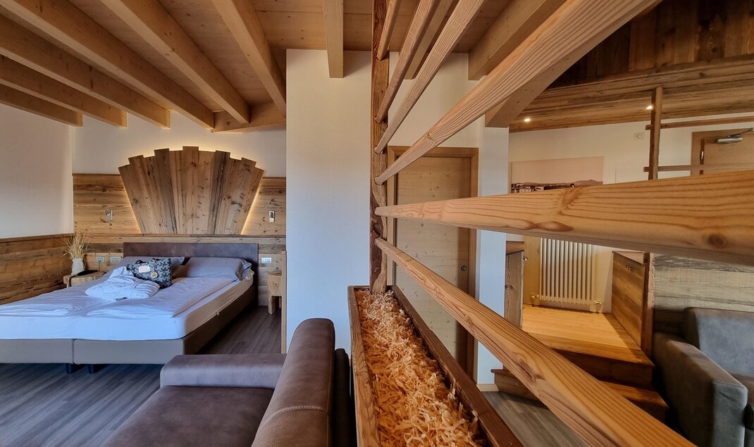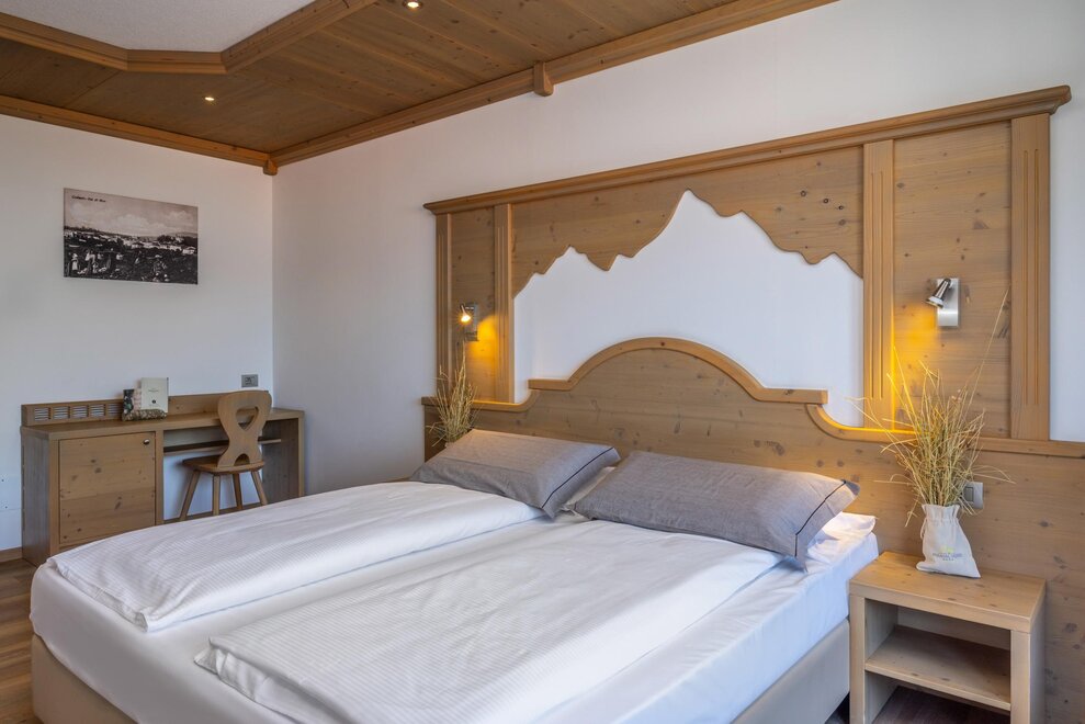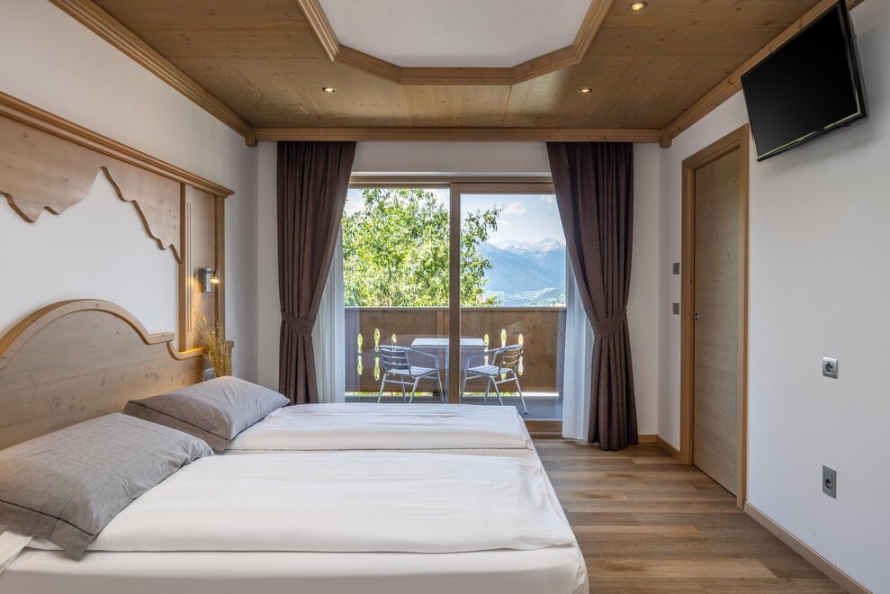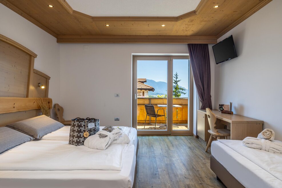 Brandneue Doppelzimmer mit drittem Bett geeignet auch für Erwachsene; mit Tannenholz eingerichtet im typischen Alpen Stil; mit Balkon mit Stühle und Tisch, geräumigen Bad mit Duschwand, Fön, WC, Bidet, Pflegeset, begehbaren Kleiderschrank, Safe, telefon, Sat TV, free Wi-Fi, und Wellness- Tasche mit Handtuch und Bademantel ausgestattet. Für Familien mit kleinen Kindern (0-3 Jahre alt) gibt es die Möglichkeit auch ein Kinderbett hinzuzufügen. Maximal Belegung 3 Personen + Kinderbett; mit Aufzug.