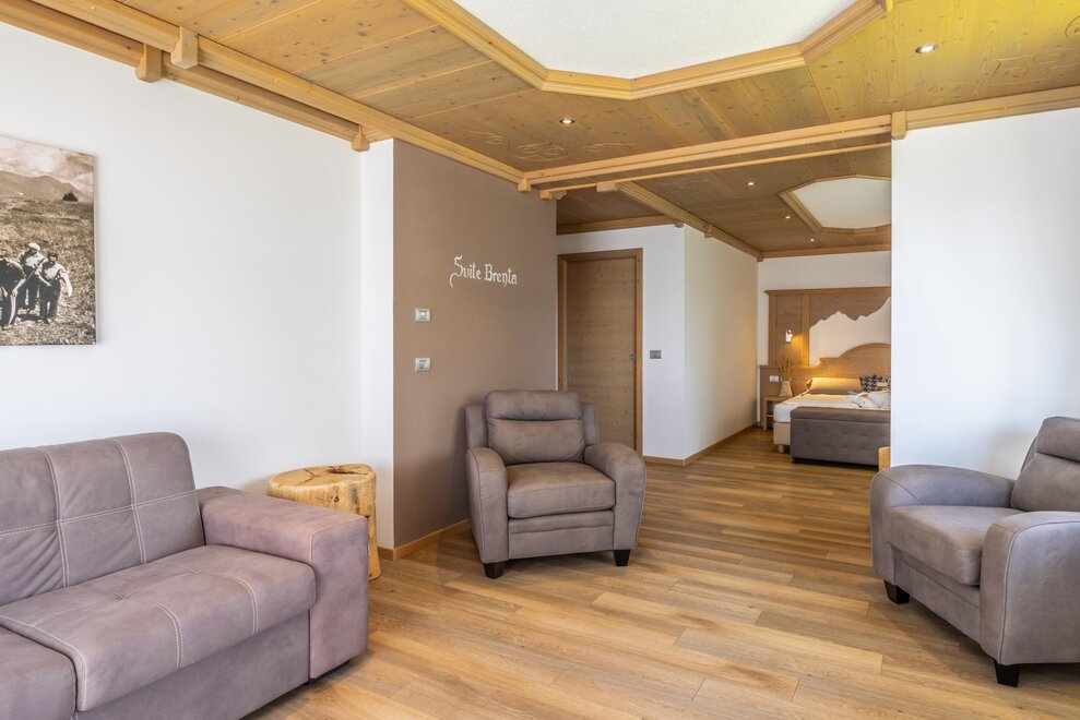 Die 3 Mountain Suite sind gemütliche und warme openspace mit Doppelbett, hellem Wohnbereich mit Schlafsofa; Bad mit Badewanne/Dusche, Fön, WC, Bidet, Pflegeset, begehbaren Kleiderschrank, Safe, 2 Sat TV, free Wi-fi und Wellness- Tasche mit Handtuch und Bademantel. Alle mit großem Balkon, einer der Suiten hat privaten Garten: mit Aussicht auf die Brenta Dolomiten und auf die Magdalener Berge. Die Suiten eigen sich auch für Familien: maximal Belegung 4 Personen + Kinderbett; mit Aufzug.