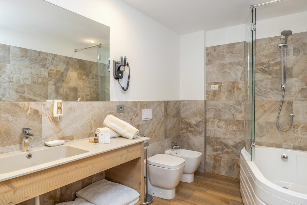 Dieses Zimmer bietet einen kleinen Eingang und zwei komunizierende Zimmer, jedes mit Bad mit Dusche, WC, Bidet, Pflegeset, begehbaren Kleiderschrank, Safe, Telefon, Sat TV, free Wi-Fi, und Wellness- Tasche mit Handtuch und Bademantel ausgestattet. In einem Zimmer gibt es die Möglichkeit ein drittes Bett hinzufügen. Maximal Belegung 5 Personen + Kinderbett. Mit Aufzug.