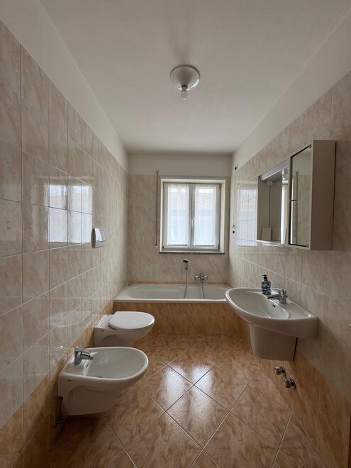 Waschtisch, Dusche oder Badewanne, WC, Bidet