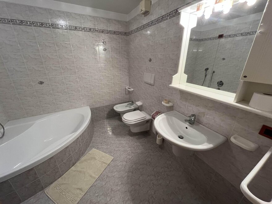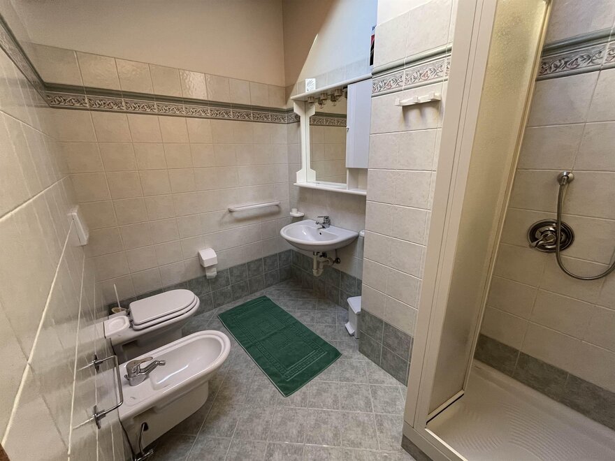 Die Wohnung ist geräumig (90 m²) und erstreckt sich über zwei Etagen. Im ersten Stock gibt es die Küche mit Abstellraum, das Wohnzimmer, ein Badezimmer und den Balkon. Im zweiten Stock befinden sich zwei Schlafzimmer, eines mit Doppelbett und eines mit zwei Einzelbetten, sowie ein weiteres Badezimmer. Sie ist ausgestattet mit Waschmaschine, Geschirrspüler, Bügeleisen und Bügelbrett, Haartrockner, Staubsauger, TV und kostenlosem Internetzugang.