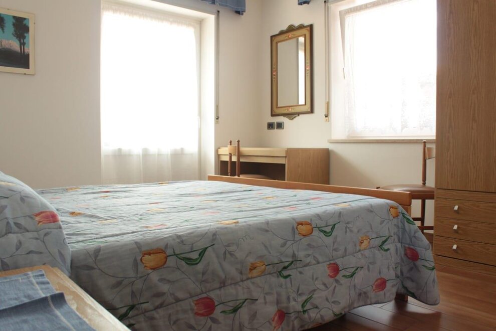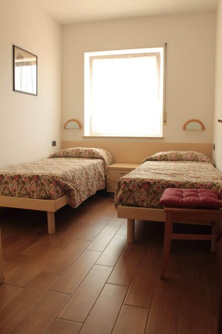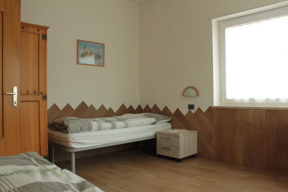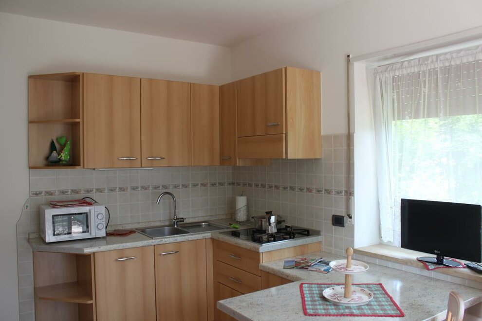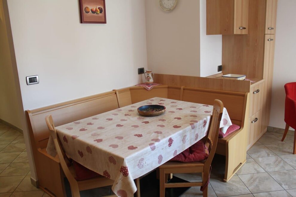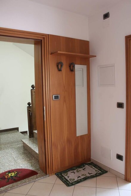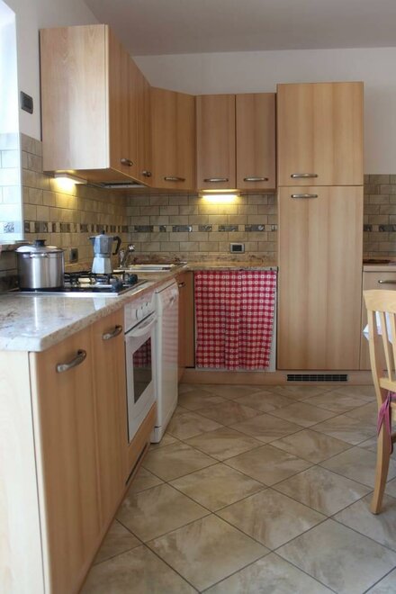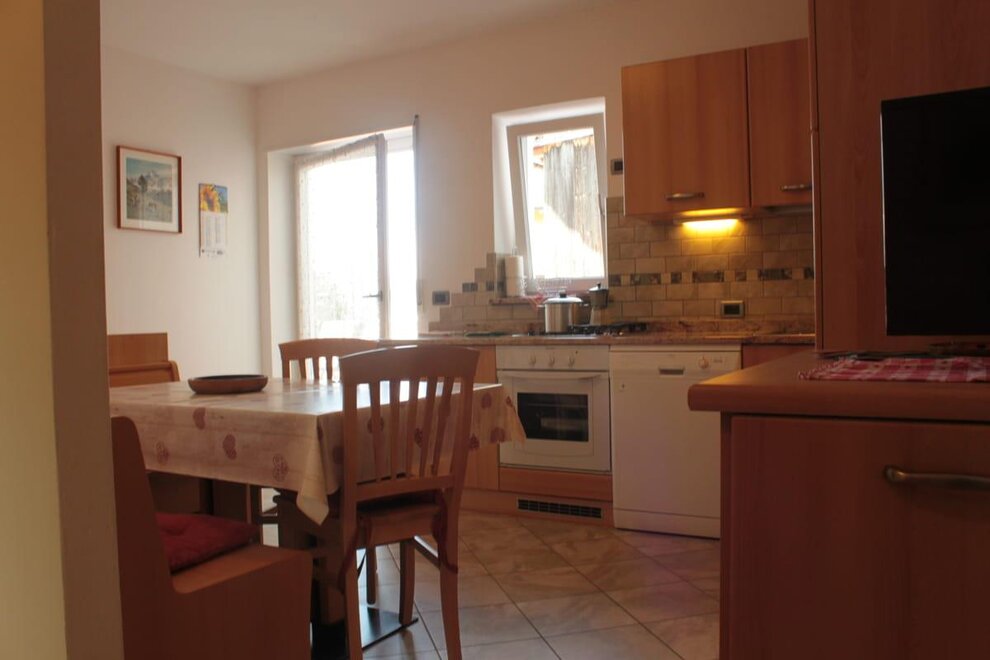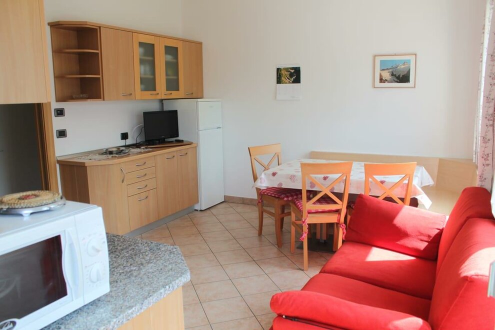 Es besteht aus einem Flur, einer offenen Küche mit Wohnbereich, einem Schlafzimmer mit Doppelbett und einem mit zwei Betten (die zu einem Doppelbett zusammengestellt werden können), Badezimmer mit Badewanne-Dusche. Die Küche und die beiden Schlafzimmer öffnen sich zu einer sehr großen, sonnigen Terrasse mit Blick auf die Cima Dodici des Massivs der Monzoni
