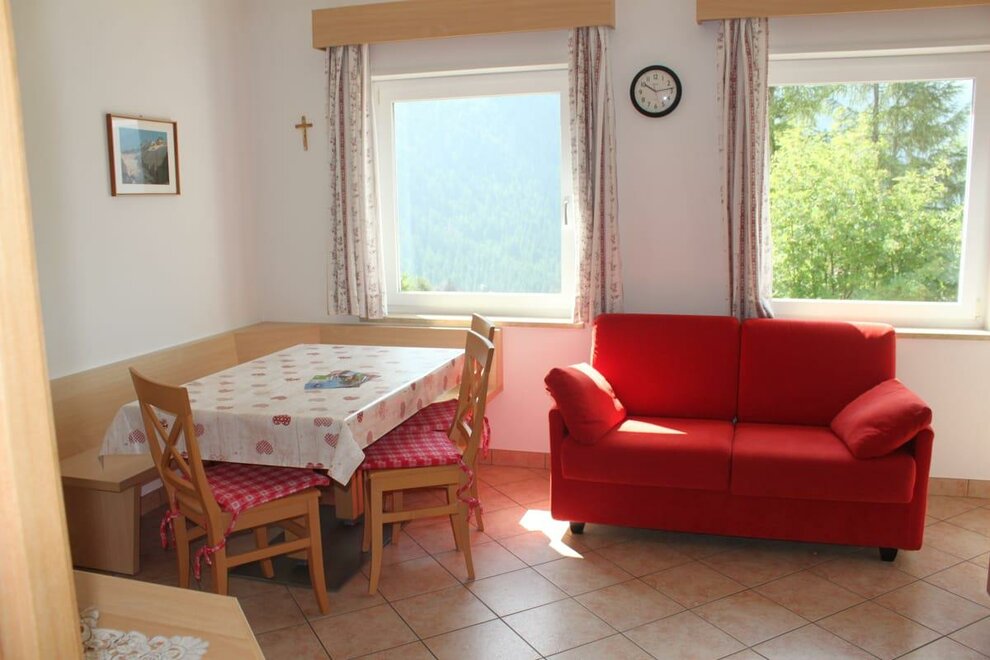 Das Apartment Arnica mit 55 qm erreicht man, indem man zwei Treppenstufen vom Haupteingang auf Straßenniveau hinuntergeht, befindet sich jedoch im ersten Stock mit Blick auf die Ciasa Pollam vom Garten aus