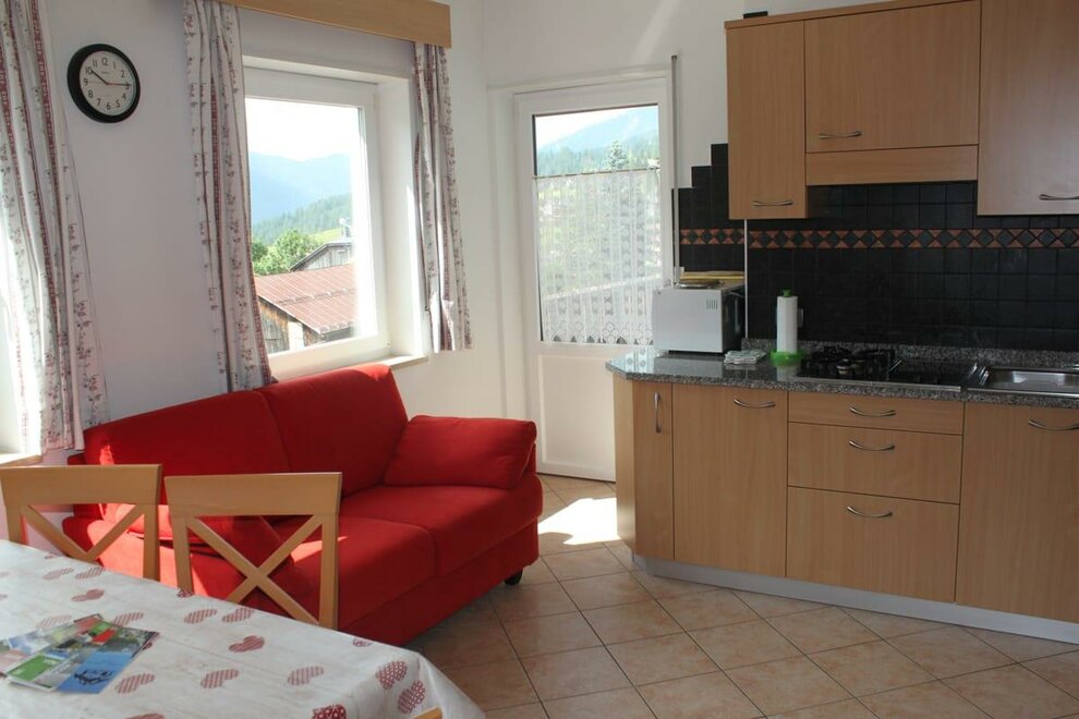 Ideal für Singles und Paare, besteht das Apartment Erika aus einem Eingangsbereich, einer offenen Küche mit Wohnbereich, der sich auf eine sehr große, sonnige Terrasse mit Blick auf die Cima Dodici des Massivs der Monzoni öffnet, einem Schlafzimmer mit Doppelbett und einem Fensterbad mit Dusche.