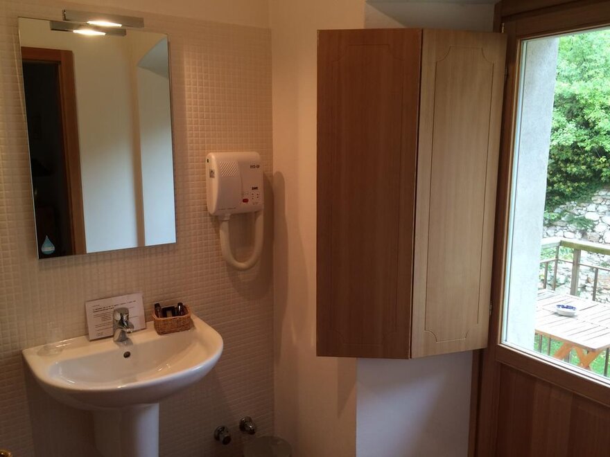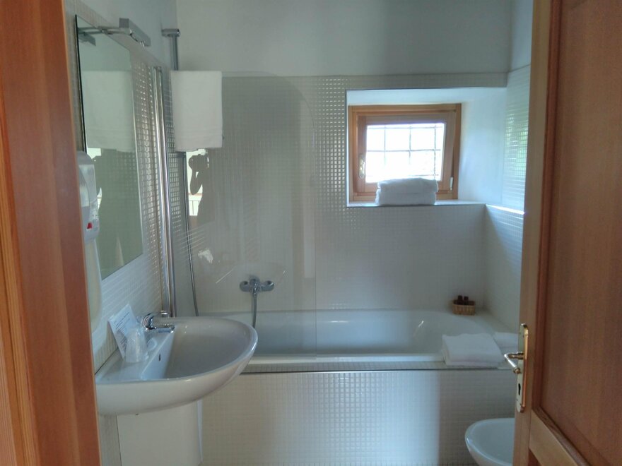 Helle Zimmer im ersten Stock, erreichbar über die originale Treppe des Palastes. Das Bett ist ein Doppelbett und es gibt ein Fenster mit Panoramablick sowohl vom Schlafzimmer als auch vom Badezimmer mit Badewanne und Duschkopf.