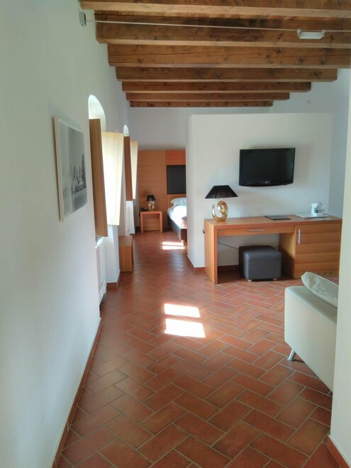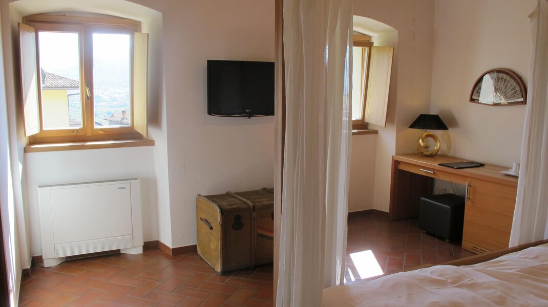 Helles Zimmer im ersten Stock, erreichbar über die originale Treppe des Palastes. Das Zimmer verfügt über ein französisches Bett und ein Fenster mit Panoramablick. Das Badezimmer hat eine geräumige Dusche und einen privaten Balkon mit Blick auf Schloss Noarna.