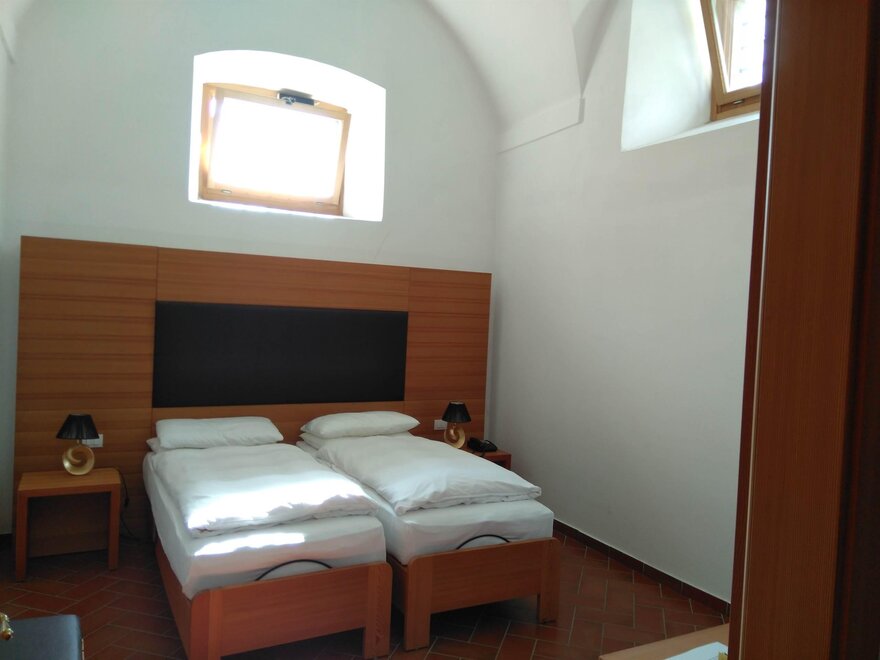 Zimmer im Erdgeschoss mit 2 getrennten Betten und einem Bad mit offener Dusche. Das Zimmer hat eine Gewölbedecke und nicht abdunkelbare Fenster ohne Aussicht sowie ein Bad mit Sitz und Armlehne.