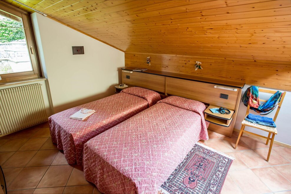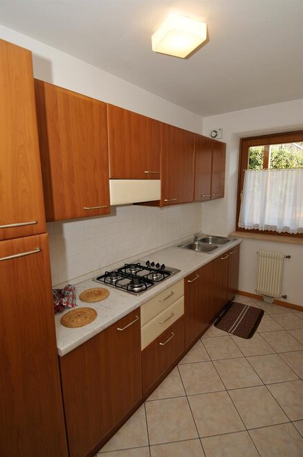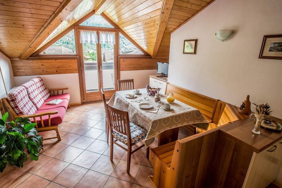 Die Wohnungen bestehen aus Wohnzimmer mit Kochecke und einer Schlafcouch mit zwei eingebauten Betten, ein oder zwei Doppelzimmern, WC und Dusche mit Fön, sowie Balkon mit Aussicht auf den See oder die Brenta Dolomiten.