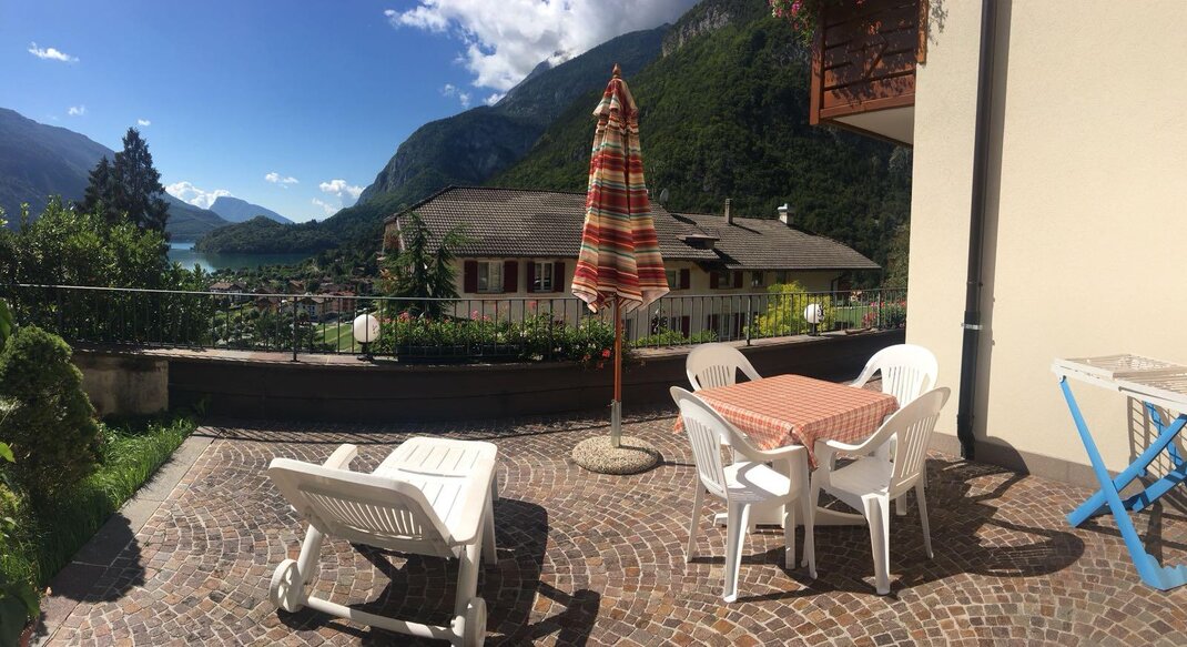2-Zimmer-Wohnung, ein Schlafzimmer, Wohnzimmer mit Kochnische und Schlafsofa, Dusche-WC, eigene Terrasse, Blick auf den See und die Brenta-Dolomiten