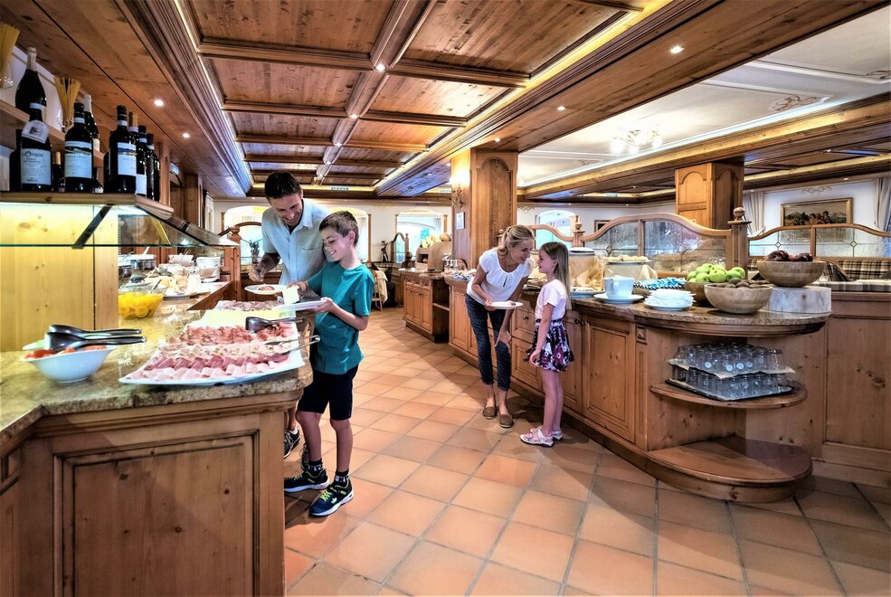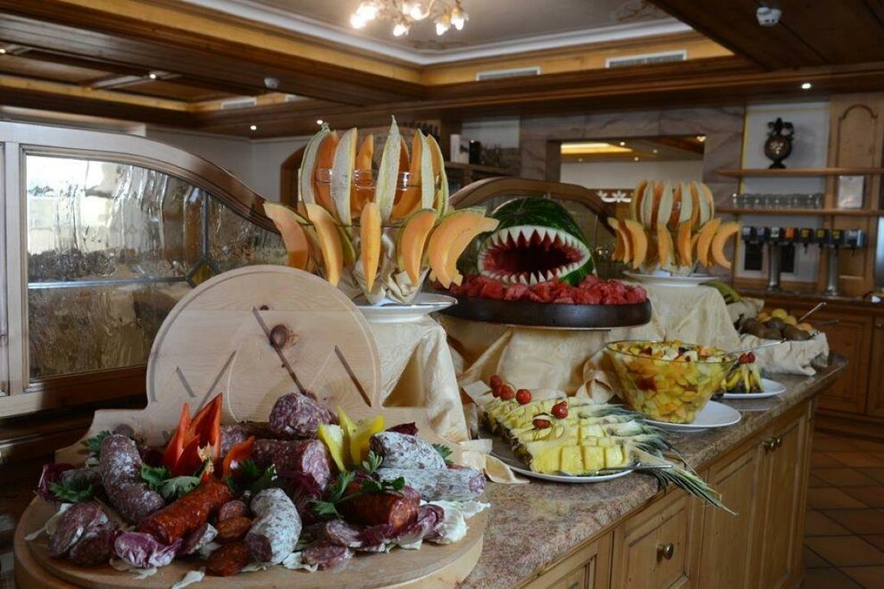 - Reichhaltiges Frühstücksbüffet, köstlichen Nachmittagsbüffet, Abendessen mit Menüs zur Auswahl mit Degustationsmenü, Alpine Wellness Gerichten, lokale Spezialitäten und Kindersmenüs. Größe Buffet mit Salaten, Gemüse, Käse und Obst