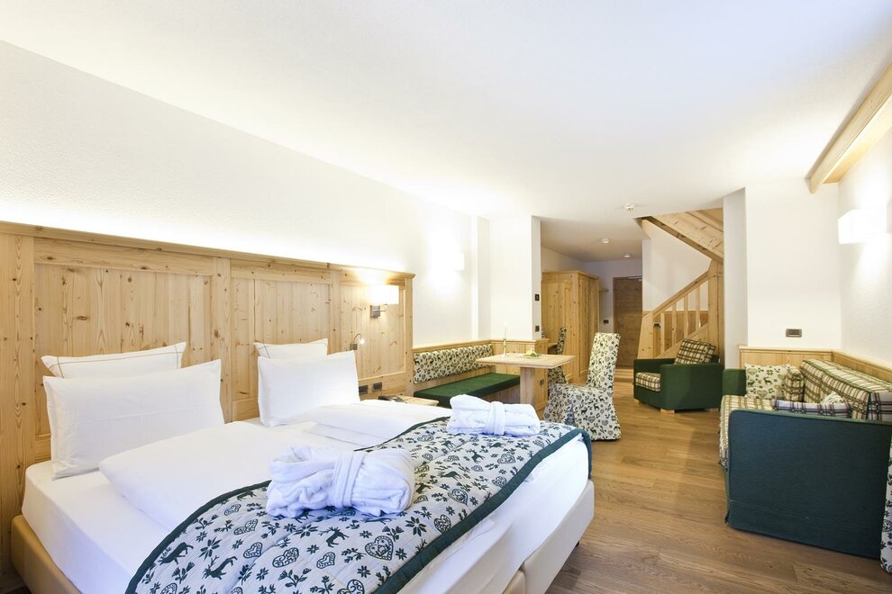 Helle Mansarden Suite im Zirbe von 51 m² auf zwei Etagen mit zwei 2 Balkone, geräumiges Wohnbereich mit Couchbett und Sesseln, große Schlafzimmer, 2 Sat-TV, Safe, Telefon, Minibar, WiFi Internetanschluss, Bad mit Dusche und Badewanne, Schminkspiegel und Haartrockner.