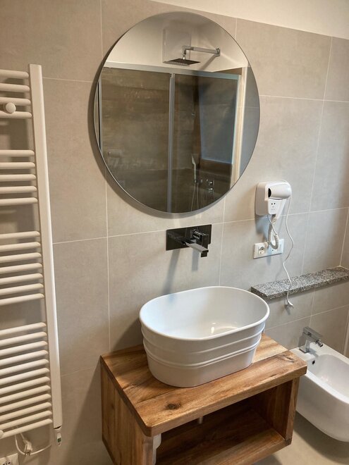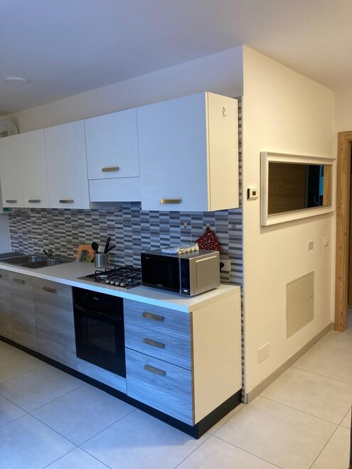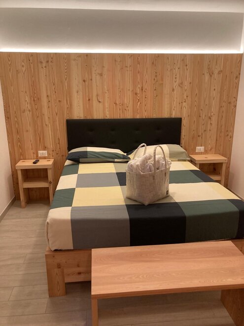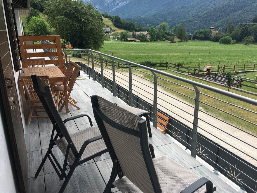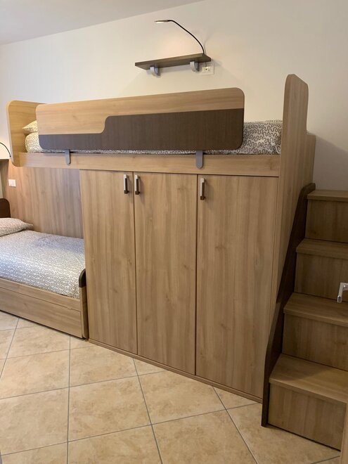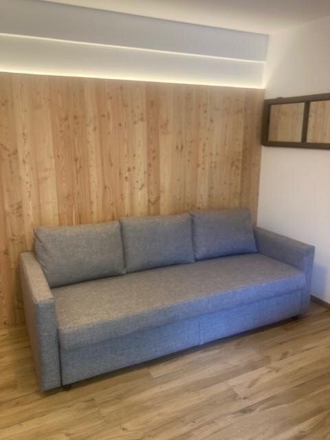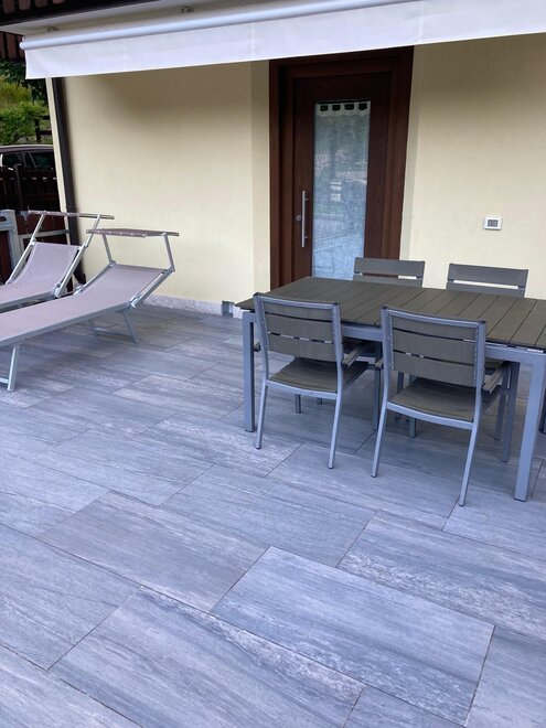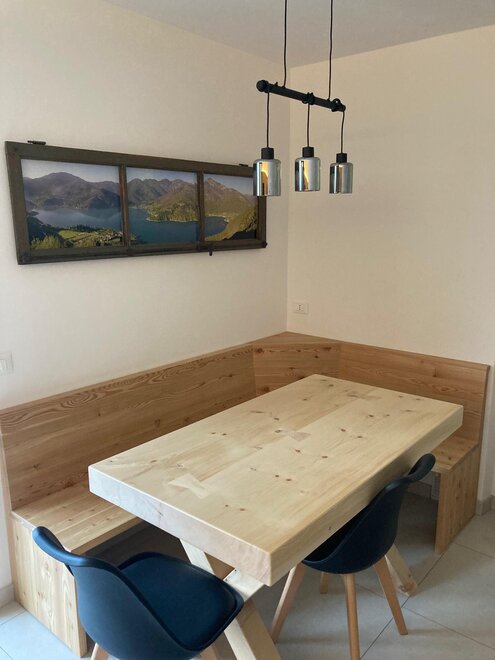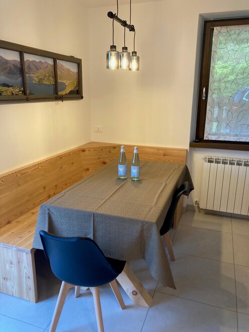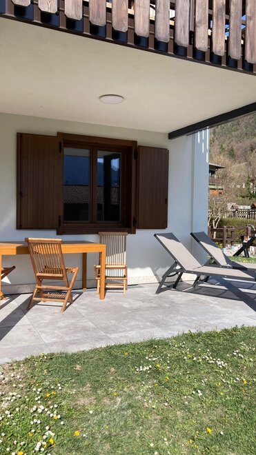 Renovierte Ferienwohnung am ersten Stock mit Terrasse, alle im rustikalen Alpenstil eingerichtet, buchbar für 2 bis 5 Betten; Badezimmer mit Dusche, WC, Bidet, Haartrockner, kompletter Satz Handtücher und Pflegeprodukten, Gartenmöbel mit Tisch, Stühlen und Liegestühlen, um Mittag- und Abendessen im Freien zu genießen. Im Gemeinschaftsgarten gibt es auch einen Grill zum hervorragenden Grillen. Das Wohnzimmer ist mit einem Schlafsofa, Sat-TV, einer Küchenzeile mit Induktionskochfeld, einem Kühlschrank, einer Mikrowelle, einem Geschirrspüler, Geschirr und Kochgeschirr, Küchenutensilien und kostenlosem WLAN ausgestattet. FI in der gesamten Anlage.