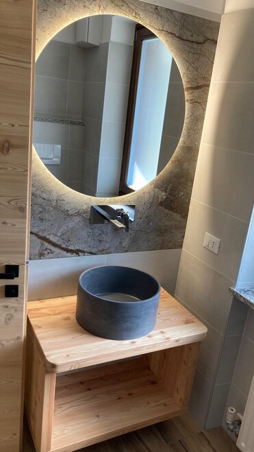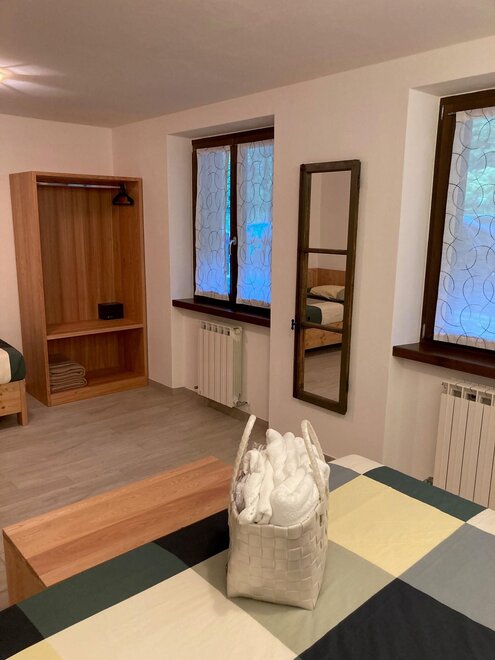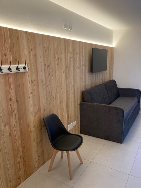 Renovierte Erdgeschosswohnungen mit eingezäunter Terrasse, alle im rustikalen Alpenstil eingerichtet, buchbar für 2 bis 5 Betten; Badezimmer mit Dusche, WC, Bidet, Haartrockner, kompletter Satz Handtücher und Pflegeprodukten, Gartenmöbel mit Tisch, Stühlen und Liegestühlen, um Mittag- und Abendessen im Freien zu genießen. Im Gemeinschaftsgarten gibt es auch einen Grill zum hervorragenden Grillen. Das Wohnzimmer ist mit einem Schlafsofa, Sat-TV, einer Küchenzeile mit Induktionskochfeld, einem Kühlschrank, einer Mikrowelle, einem Geschirrspüler, Geschirr und Kochgeschirr, Küchenutensilien und kostenlosem WLAN ausgestattet. FI in der gesamten Anlage.
