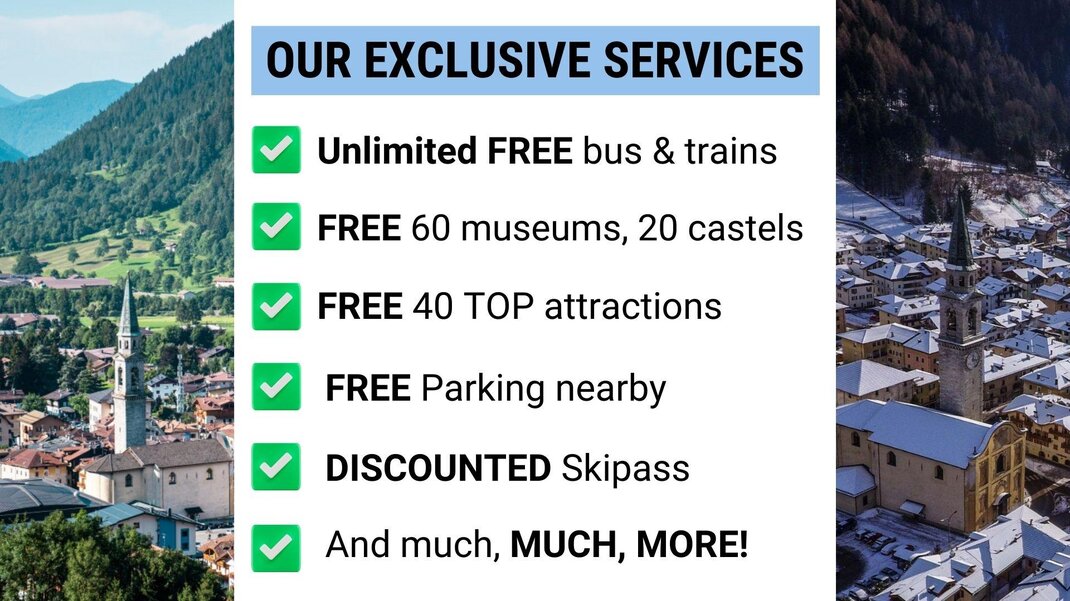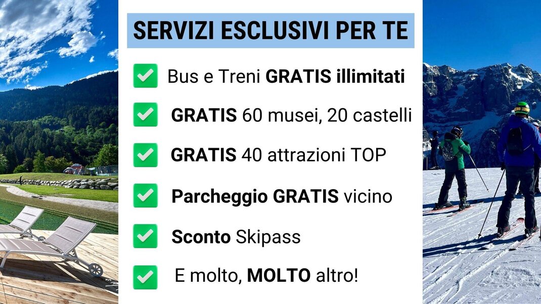 Wenn Sie hier und jetzt Ihre Übernachtungen buchen, erhalten Sie die Trentino Guest Card ganz entspannt direkt zusammen mit der Buchungsbestätigung. Man hat freien Eintritt in die meisten Museen, Schlösser und Naturparks, kann öffentliche Verkehrsmittel benutzen, und viel mehr.