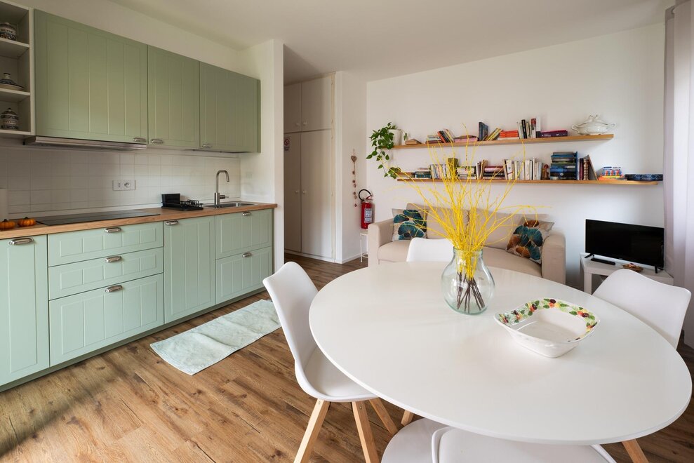In der Unterkunft gibt es eine schöne Küche mit Induktionskochfeld, Kühlschrank und Mikrowelle. Außerdem sind kleine Haushaltsgeräte vorhanden: der Toaster, der Mixer und eine Kaffeemaschine. Im Wohnzimmer beherbergt ein Bücherregal Bücher in verschiedenen Sprachen und Reiseführer zur Erkundung der Umgebung. Wir haben einen Fernseher und WLAN-Verbindung. Im Badezimmer gibt es eine Waschmaschine und einen Föhn. Im Schlafzimmer steht ein Doppelbett und im Wohnzimmer ein Schlafsofa sowie auf Anfrage einige Kinderbetten. Die Einrichtung ist modern und lebhaft.