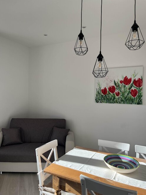 Wenn Sie als Paar reisen oder eine intimere Umgebung bevorzugen, steht in der gleichen Unterkunft ein weiteres Apartment "Sunflower apartment" mit einem Schlafzimmer mit Doppelbett und einem Schlafsofa im Wohnzimmer zur Verfügung – die ideale Option für diejenigen, die den Raum und die Ruhe der Umgebung in vollen Zügen genießen möchten.
