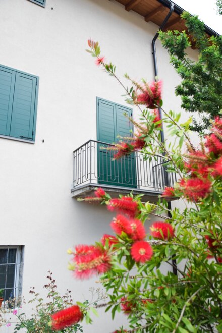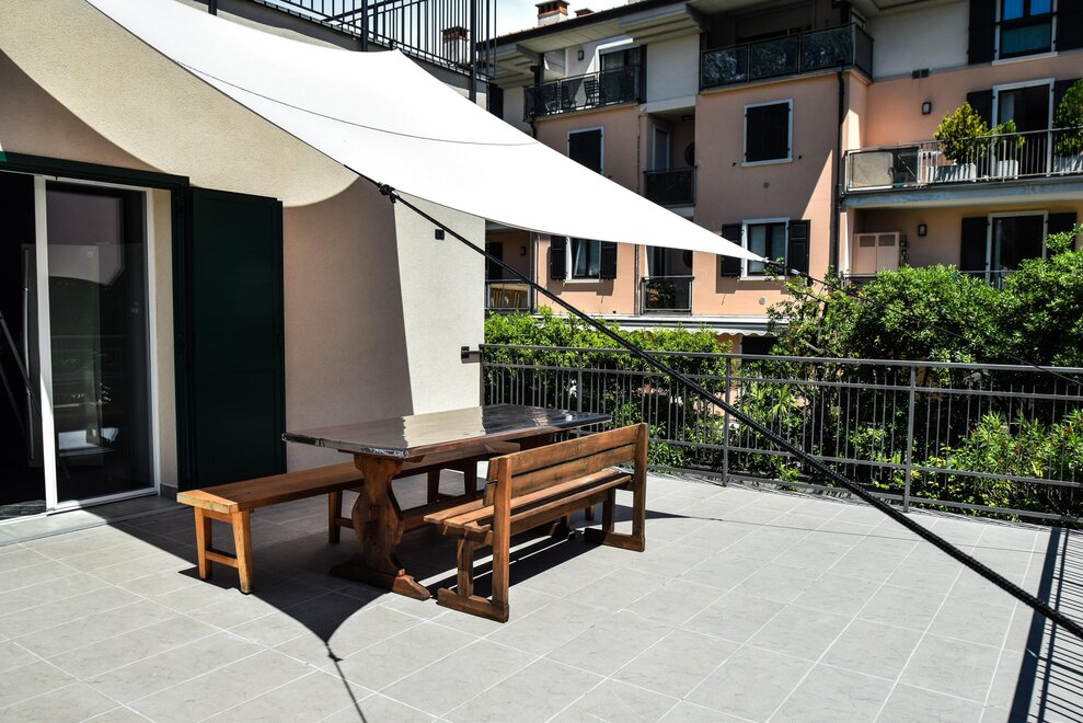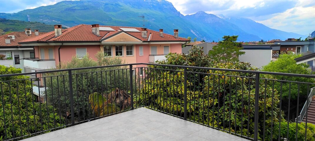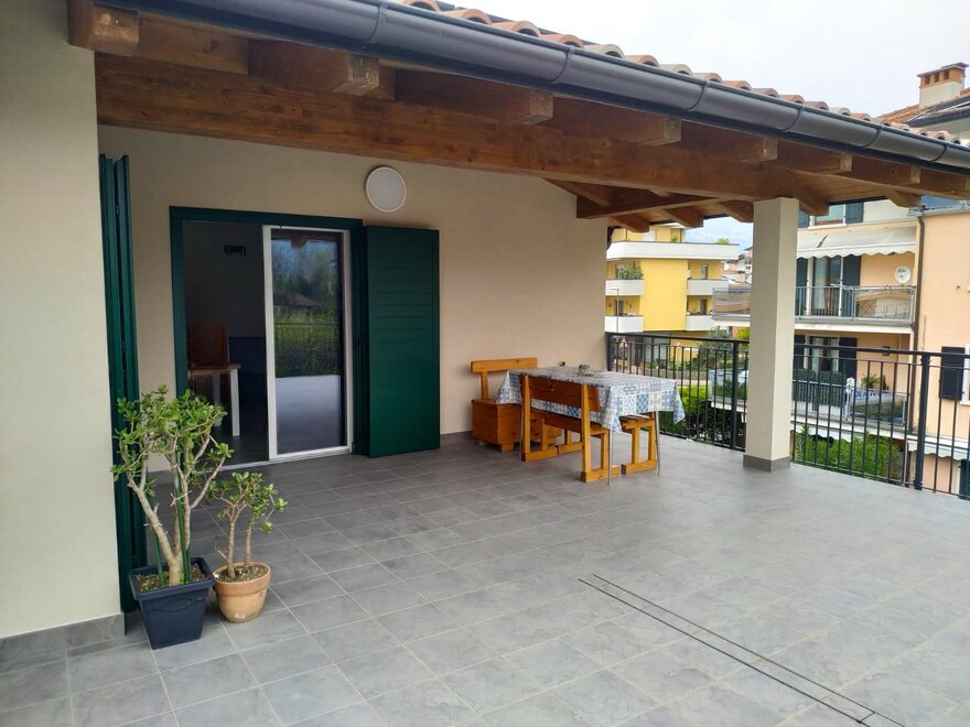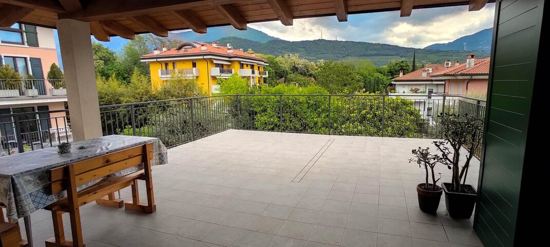 Eine sehr große private Terrasse mit Tisch und Bank ist die perfekte Location für Frühstück, Mittagessen oder Abendessen, mit wunderbarem Blick auf den Monte Baldo und auf den Garten der Villa: ein Garten mit Olivenbäumen, Zitrusgewächsen, Mispeln, Palmen und Magnolien, samt Bereichen zum Abstellen Ihrer Fahrräder und Sportausrüstungen.