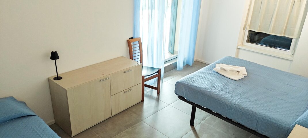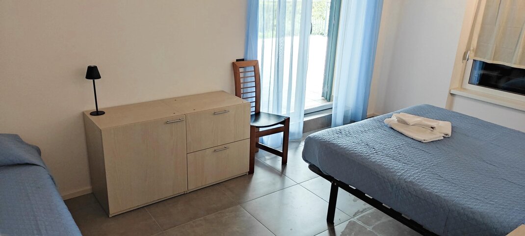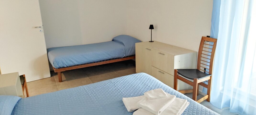 Es bietet drei Schlafzimmer: eines mit zwei Einzelbetten und einem Schlafsessel mit Fenstertür zur privaten Terrasse, ein zweites mit einem Doppelbett und einem Einzelbett und ein drittes, kleineres mit einem Einzelbett.