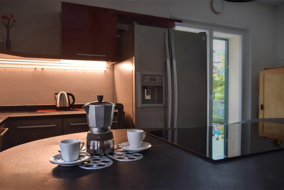 Im riesigen Wohnzimmer gibt es ein 6-Sitzer-Sofa und eine geräumige Designer-Küche mit Kühlschrank, Backofen, Induktionsherd und Wasserkocher. Außerdem steht ein Bereich zum Wäschewaschen mit einer Waschmaschine zur exklusiven Nutzung zur Verfügung. Und ein exzentrisches Badezimmer mit einer großen, komfortablen Dusche.