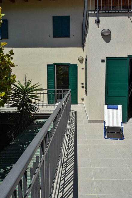 Eine sehr große private Terrasse mit Tisch und Bank ist die perfekte Location für Frühstück, Mittagessen oder Abendessen, mit wunderbarem Blick auf den Monte Stivo und auf den Garten der Villa: ein Garten mit Olivenbäumen, Zitrusgewächsen, Mispeln, Palmen und Magnolien, samt Bereichen zum Abstellen Ihrer Fahrräder und Sportausrüstungen.