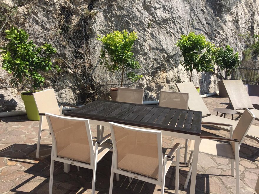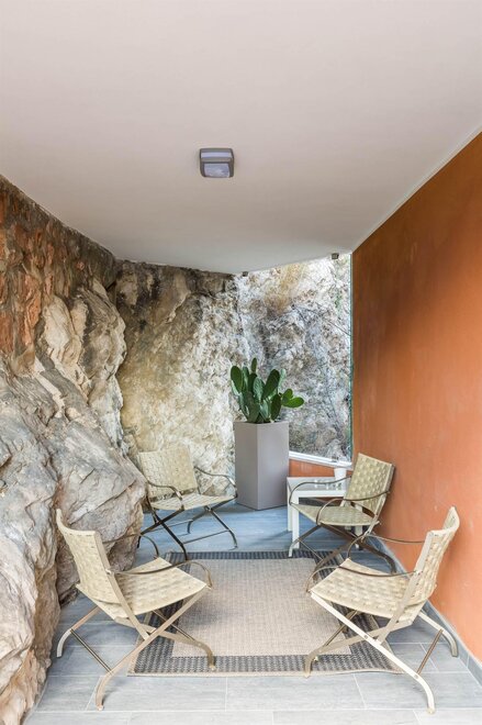 Die Wohnung im ersten Stock verfügt über eine Panoramaterrasse - die sowohl aus dem Wohnzimmer, als auch aus einem der Schlafzimmer direkt zugänglich ist - und zwei Balkone (eine mit Zugang aus der Küche und eine mit Zugang aus dem zweiten Schlafzimmer), sowie über ein privates, in den Fels eingefügtes Eck mit Panoramablick.