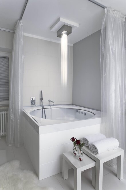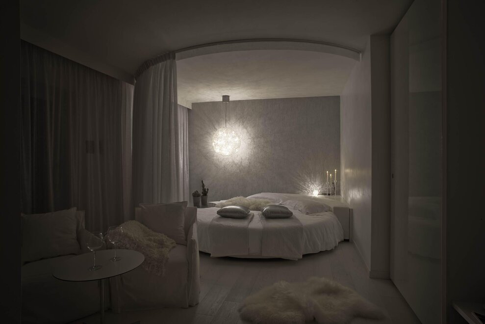 Vor dem Gaskamin dominiert das runde Bett des Designers Ivano Radaelli. Von halbdurchsichtigen Vorhängen umhüllt, bietet es dem Paar ein Nest der Intimität und Entspannung.Nicht nur die Infrarotsauna charakterisiert den Wohlfühlbereich, sondern auch die von Philippe Starck entworfene große runde Hydromassage-Wanne für zwei Personen mit der Riesendusche an der Decke, aus der ein von LEDs gefärbter, belebender Regen strömt.