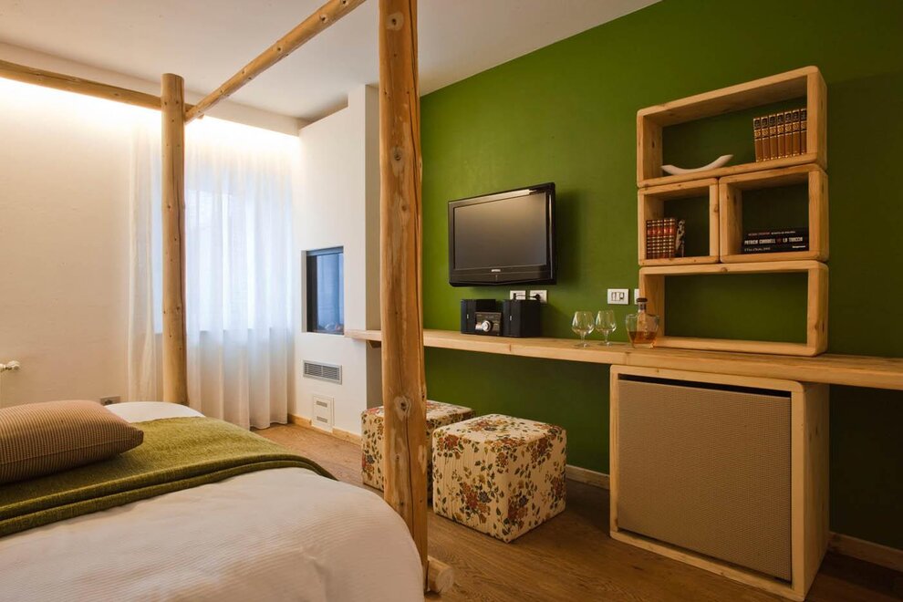 Auch der schrank und das Bücherregal sind kunsthandwerkliche Einzelstücke: einziges modernes Stück der große Flachbildschirm neben dem Kamin. Verschiedene Grüntöne sind die Hauptnuance für die Verkleidungen und die Wände dieser Location - ein harmonischer Dialog ohne Grenzen.