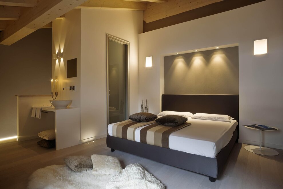 Das Wunschzimmer in der Deluxe-Version: Hier steht die zeitgenössische Designspache mit dem Luxus und der Sinneslust im Dialog. Der weitläufige Raum bietet eine suggestive und elegante Atmosphäre.