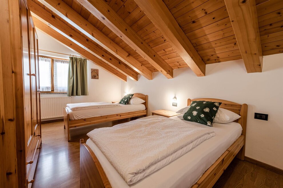 Das Apartment im ersten Stock und das Dachgeschoss der Villa bestehen aus einem Doppelzimmer, einem Schlafzimmer mit zwei Einzelbetten, einem großen Bad mit Dusche, Abstellkammer, einem Schlafzimmer mit zwei Einzelbetten, einer Wohnküche und einer Terrasse. Es kann bis zu sechs Personen beherbergen.