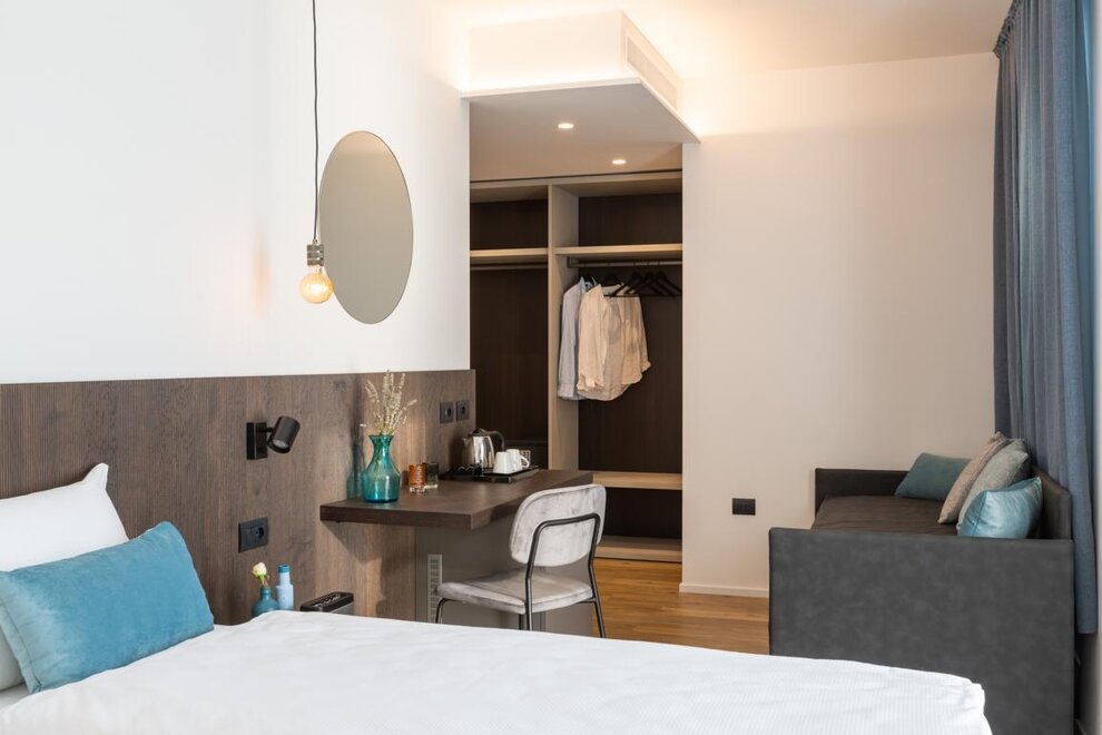 Die Zimmer verfügen über ein King-Size-Bett (182-210 cm) mit 27 cm dicken Dorelan-Matratzen, einem Full-HD-Fernseher von 45/55 Zoll mit Satelliten-TV und Internet-TV.