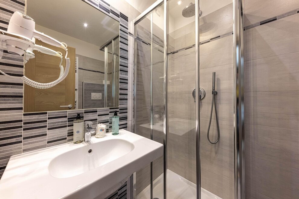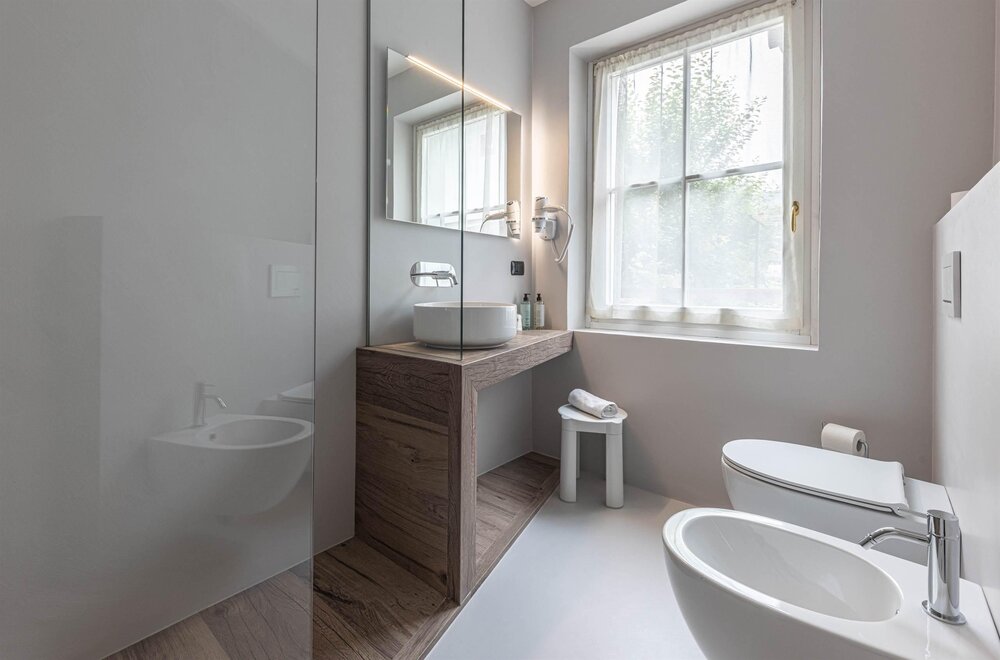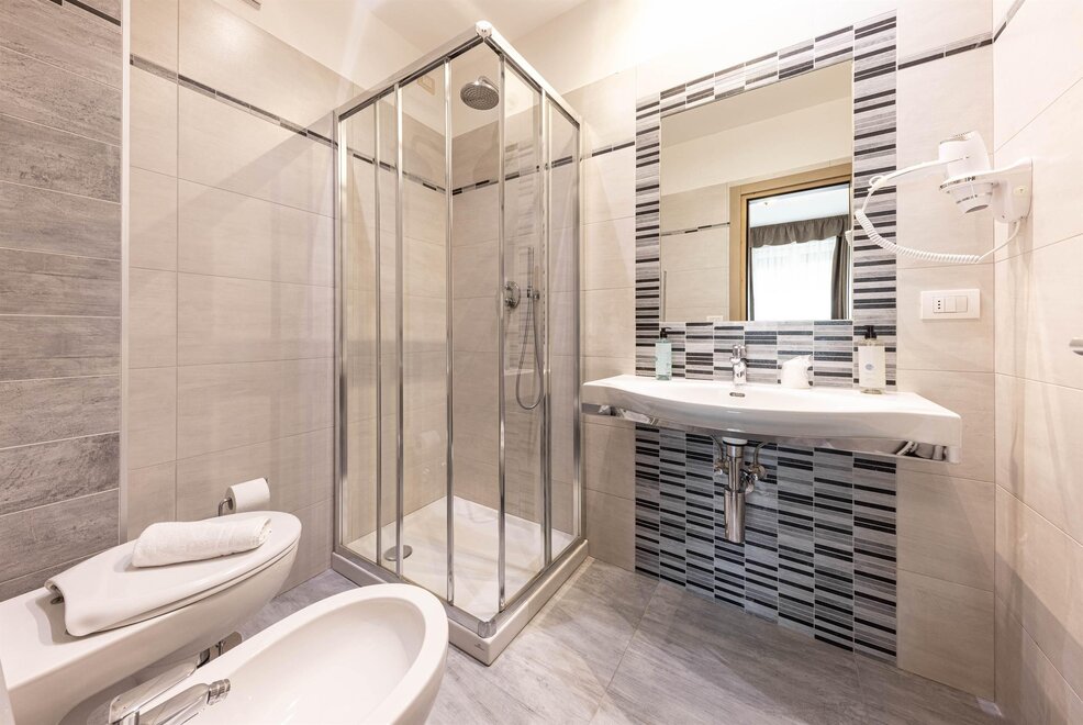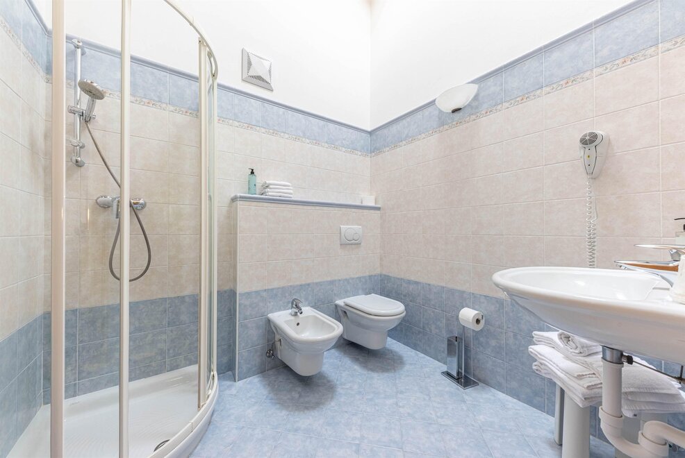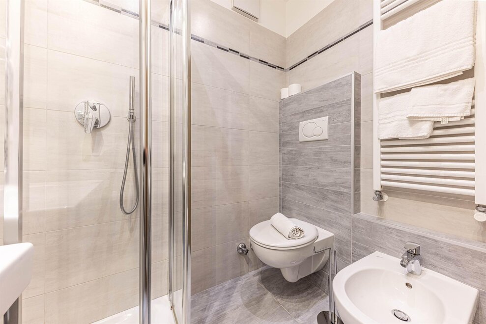 Waschtisch, Dusche oder Badewanne, Duschhocker, Fließendes Kalt- und Warmwasser, Bad, WC