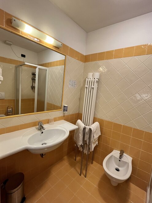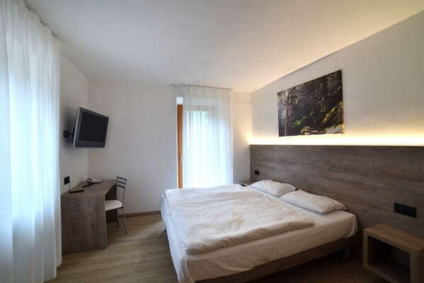Zimmer von der Größe von 12 Quadratmetern ausgestattet mit einem Doppelbett (oder zwei Einzelbetten), Kleiderschrank, Schreibtisch, TV 24 Zoll und ein Badezimmer mit WC, Bidet und Dusche.