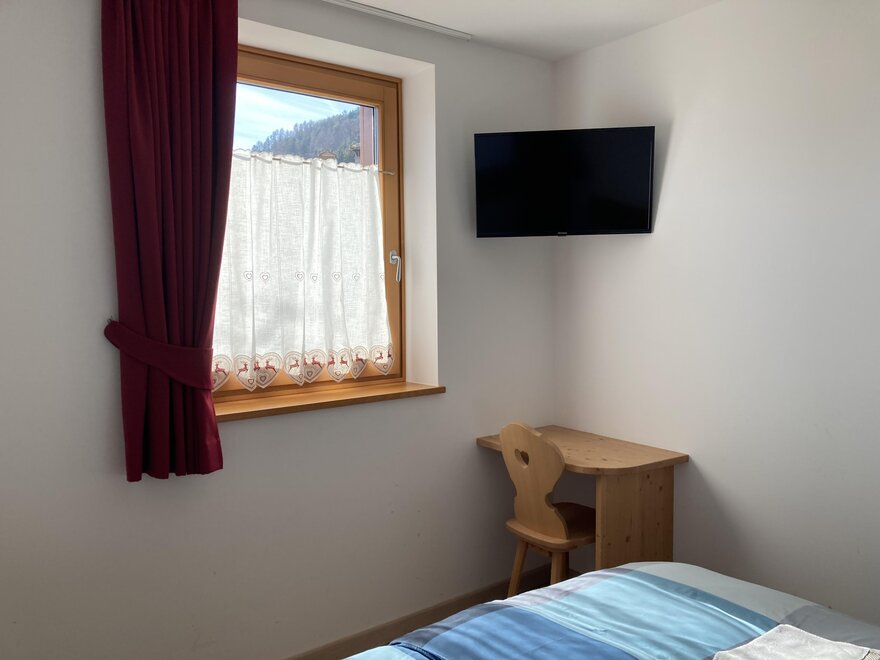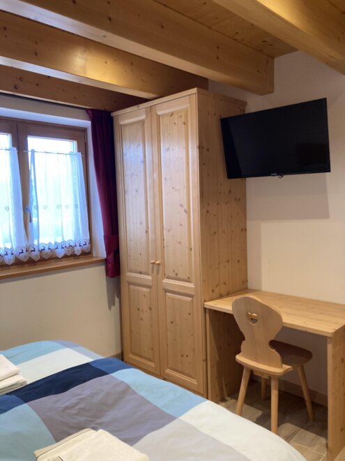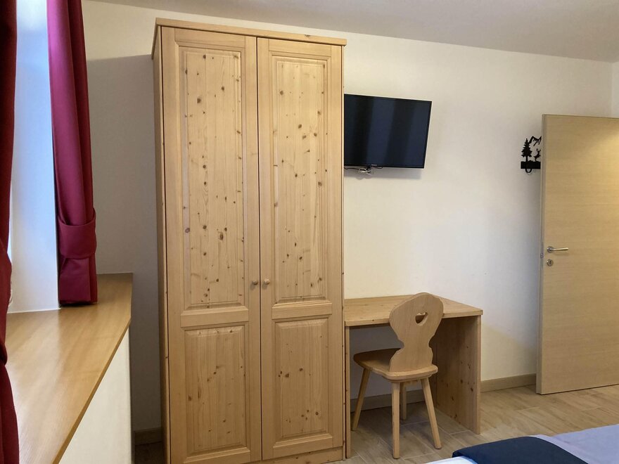 Comfortable double rooms with a private bathroom and television. The room is furnished with a wardrobe, bedside tables, a desk, and a chair.