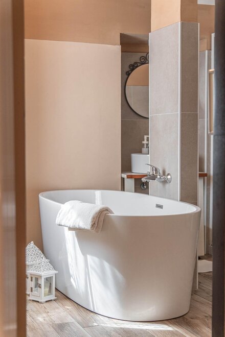 It is equipped with a canopy double bed, a foldaway kitchenette, and a large bathroom with a view bathtub.