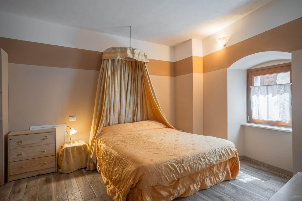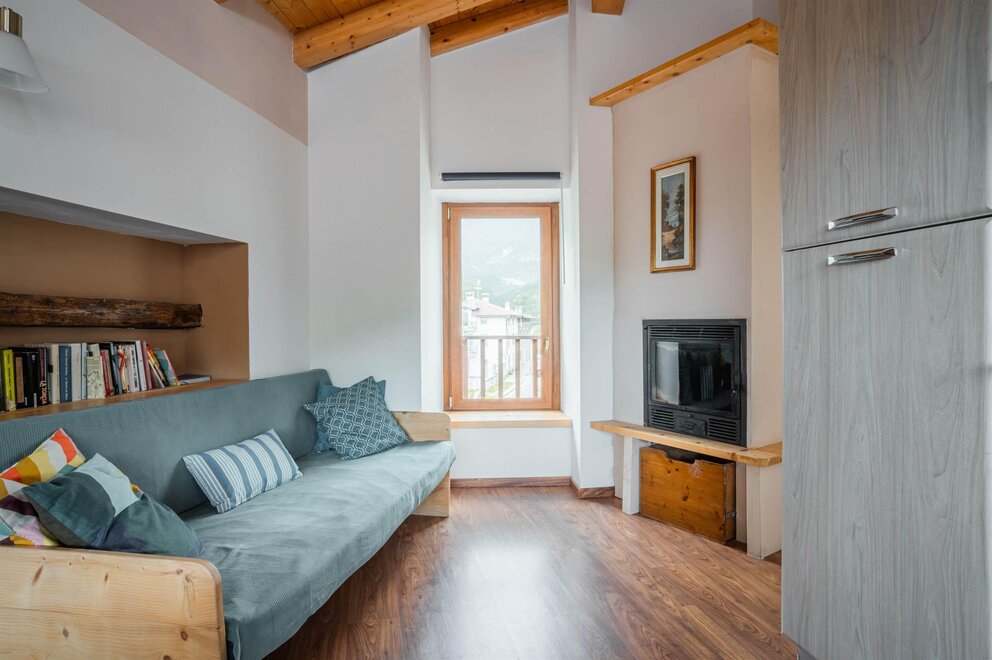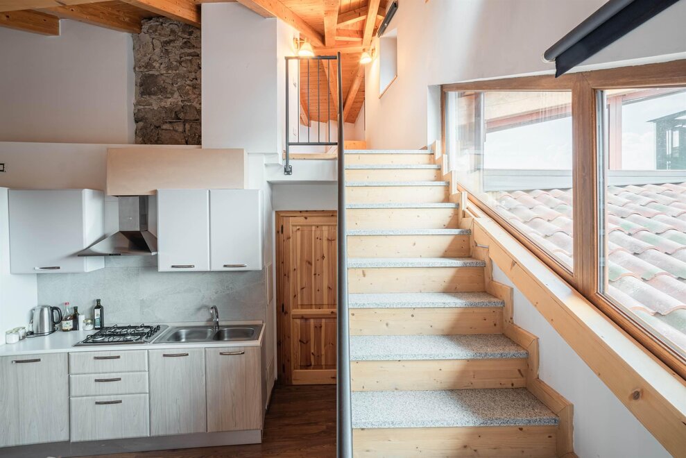 on the first level there is a kitchen-living room with a sofa bed, a double bedroom, a small terrace, and a bathroom;