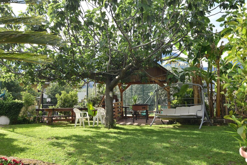 In the garden there are tables and a barbecue area.